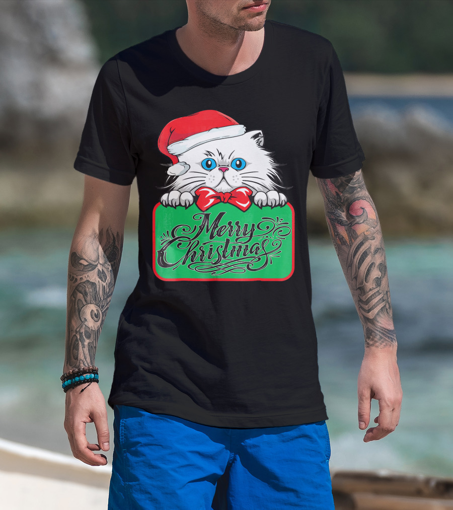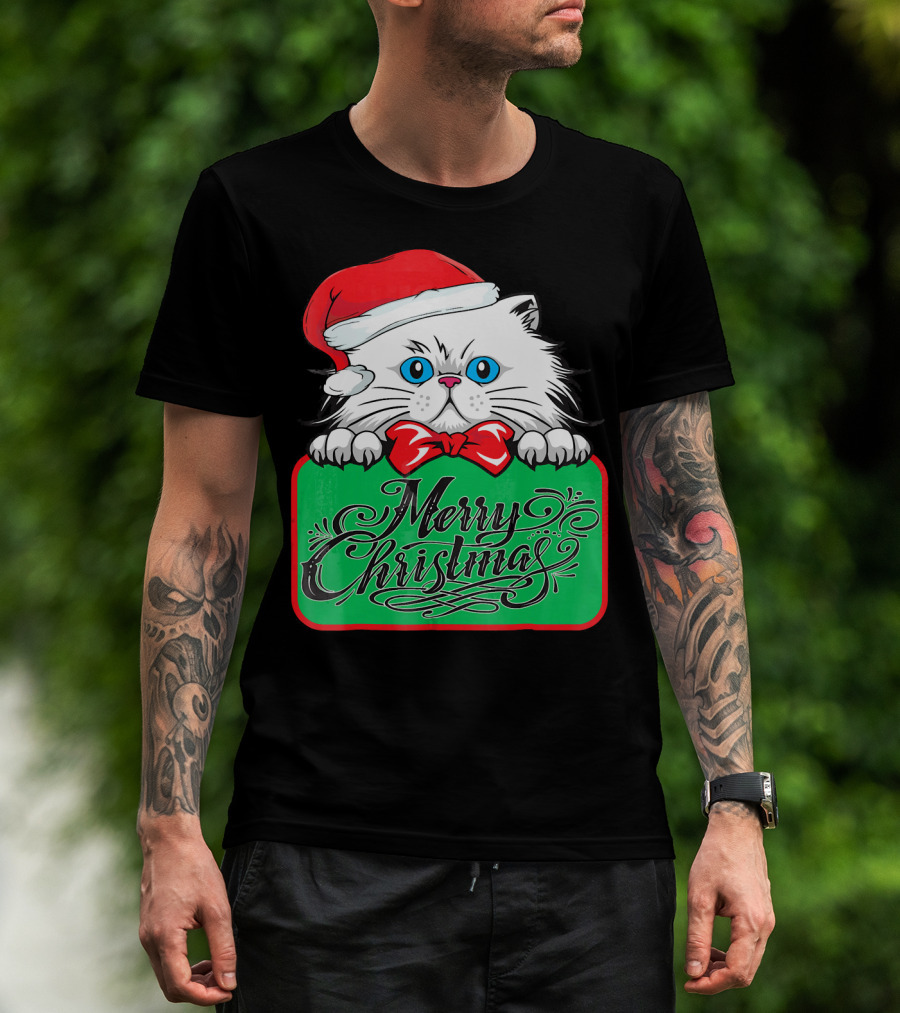 Merry Christmas Cute Cat With Santa Hat And Bow Tie T-Shirt