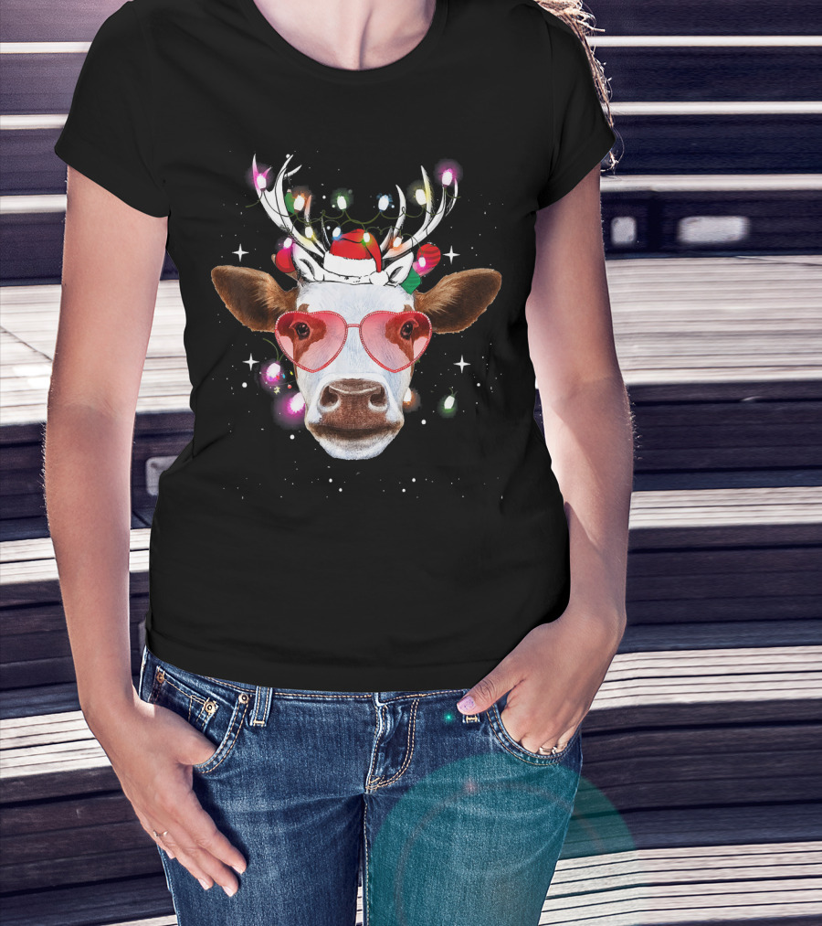 Cow With Antlers Heart Glasses And Christmas Lights T-Shirt
