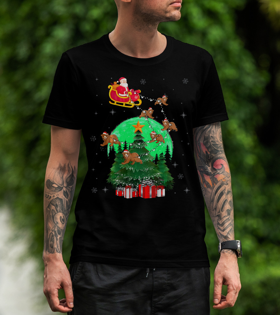 Santa Claus With Bears And Sleigh Over Christmas Tree And Presents T-Shirt