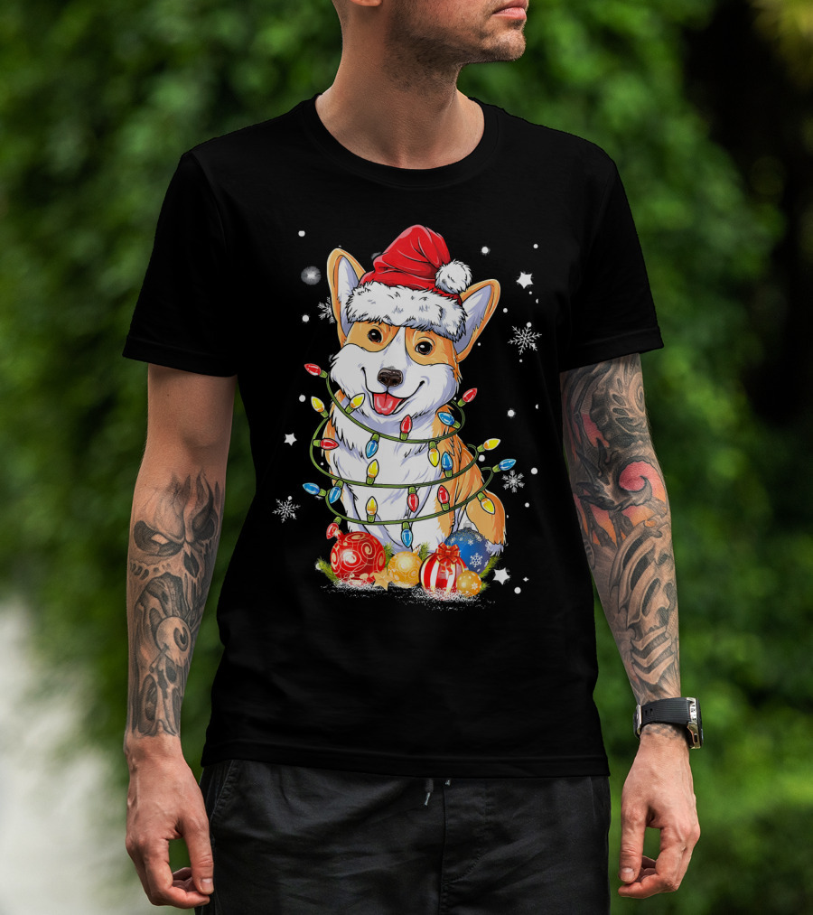 Merry Corgmas Xmas Tree Santa Corgi Wrapped In Christmas Lights And Ornaments T-Shirt