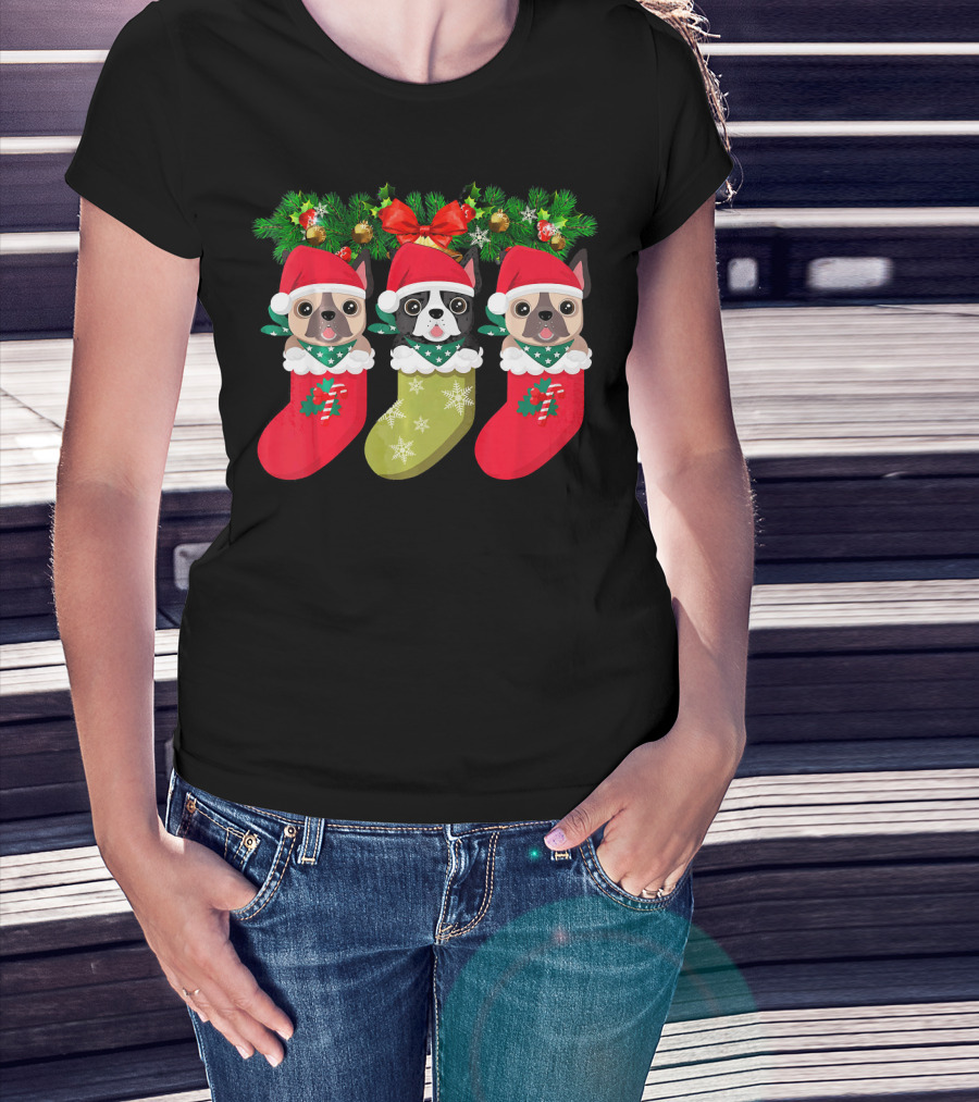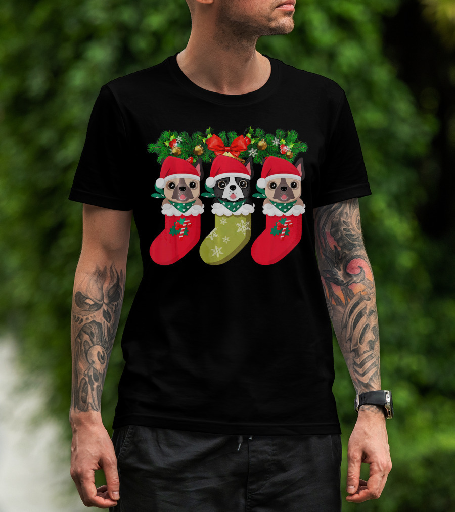 Pug Christmas Socks Festive Dog Stocking Trio With Santa Hats And Holly T-Shirt
