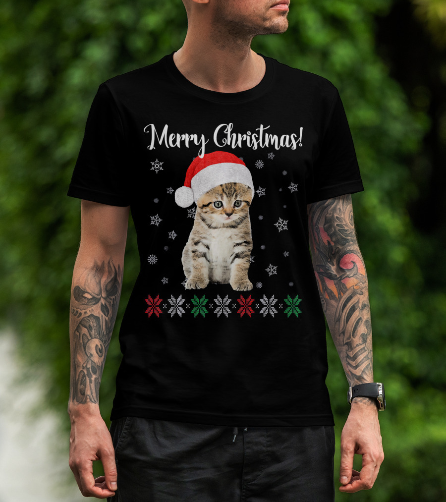 Merry Christmas Cat Wearing Santa Hat With Snowflakes And Festive Stars T-Shirt
