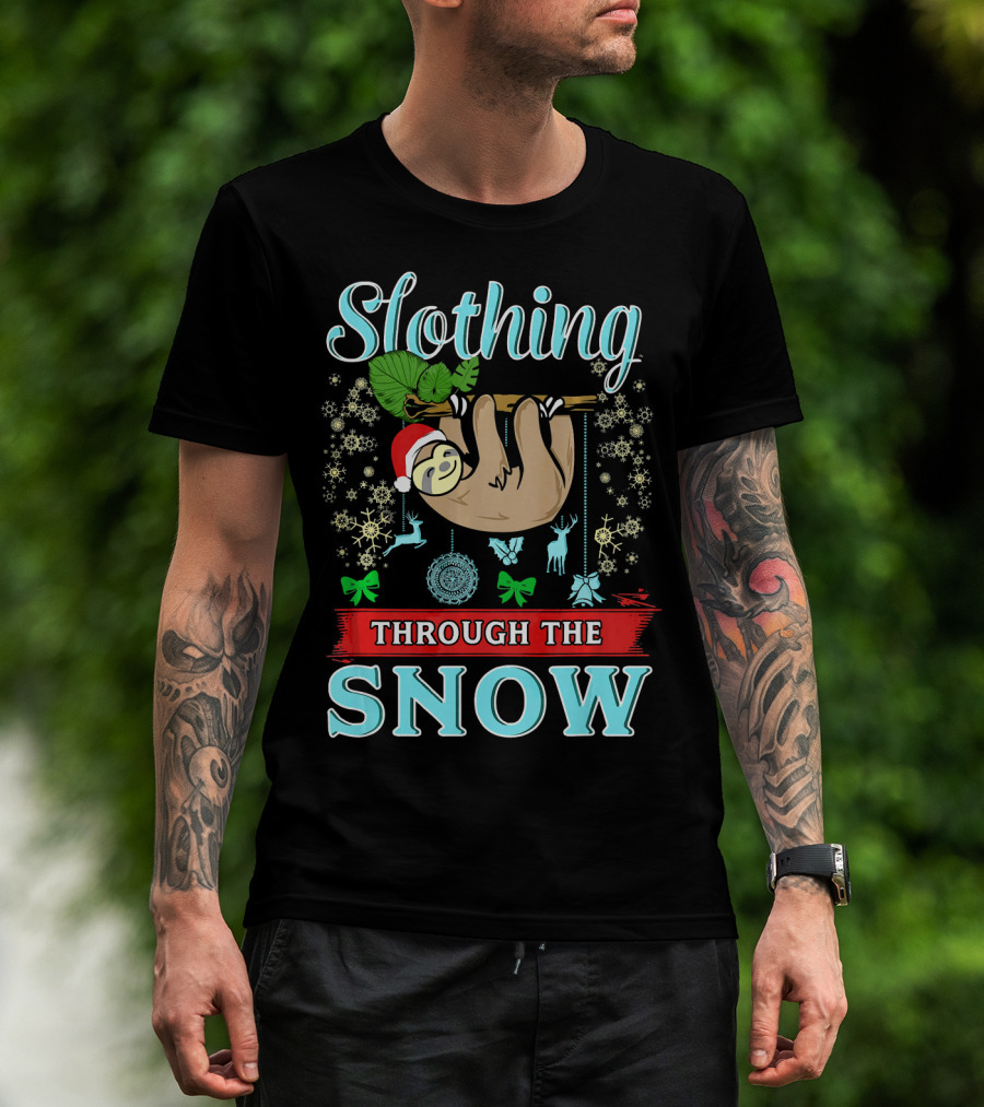 Slothing Through The Snow Cute Christmas Sloth With Santa Hat And Snowflakes T-Shirt