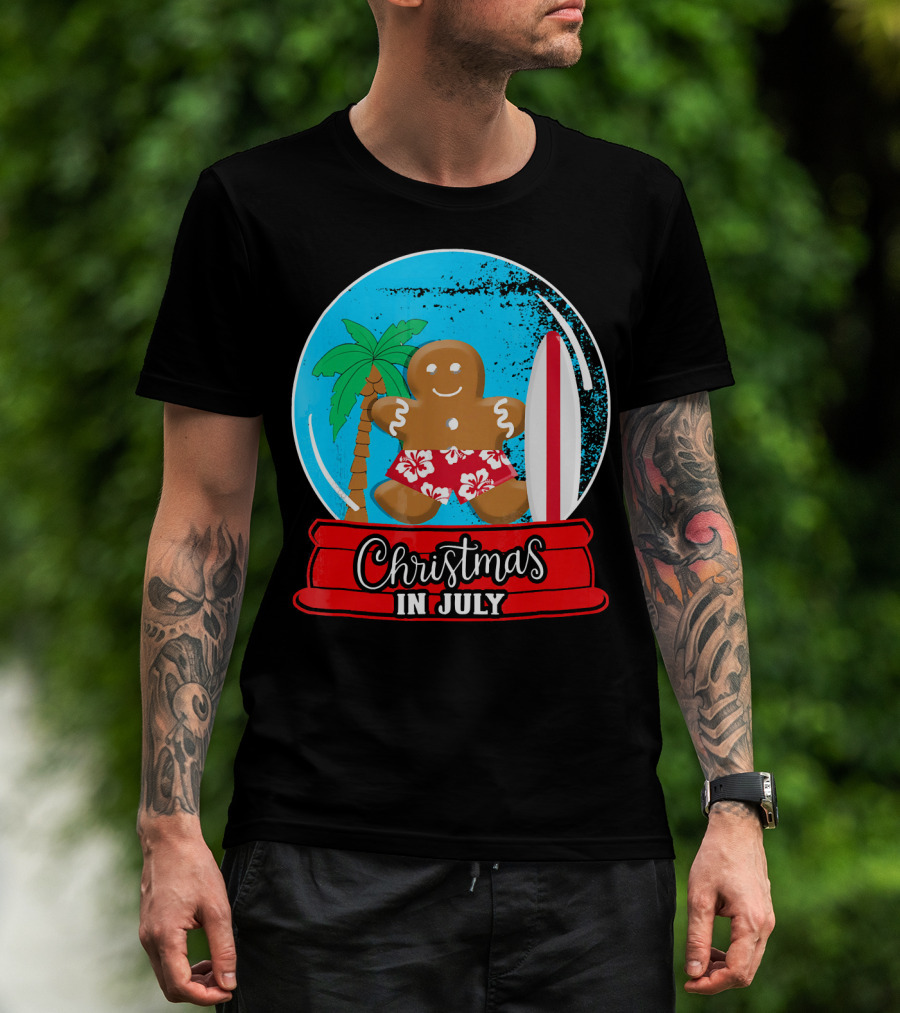 Christmas In July Surfing Gingerbread Snow Globe T-Shirt