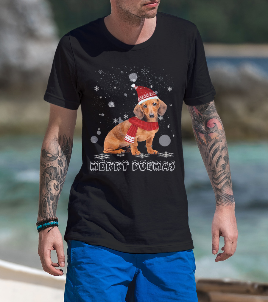 Merry Dogmas Dachshund Dog In Snow With Santa Hat And Scarf T-Shirt