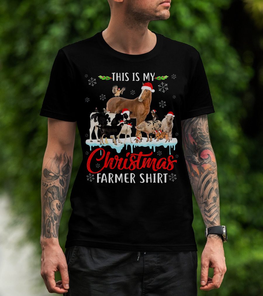 This Is My Christmas Farmer Shirt Santa Hat Animals Snowflakes T-Shirt