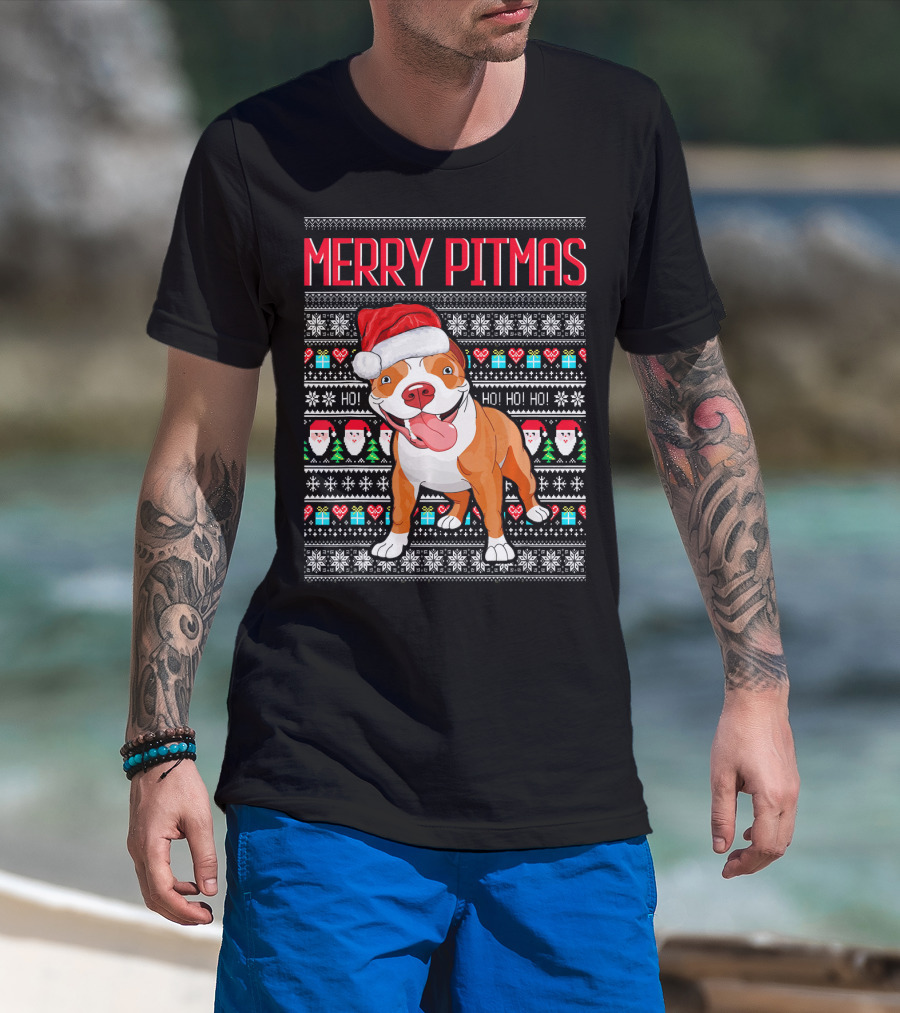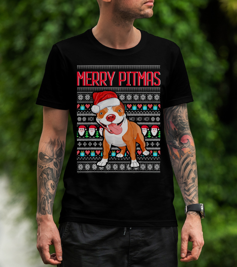 Merry Pitmas Santa Hat Dog Ho Ho Ho UglyStyle Christmas T-Shirt
