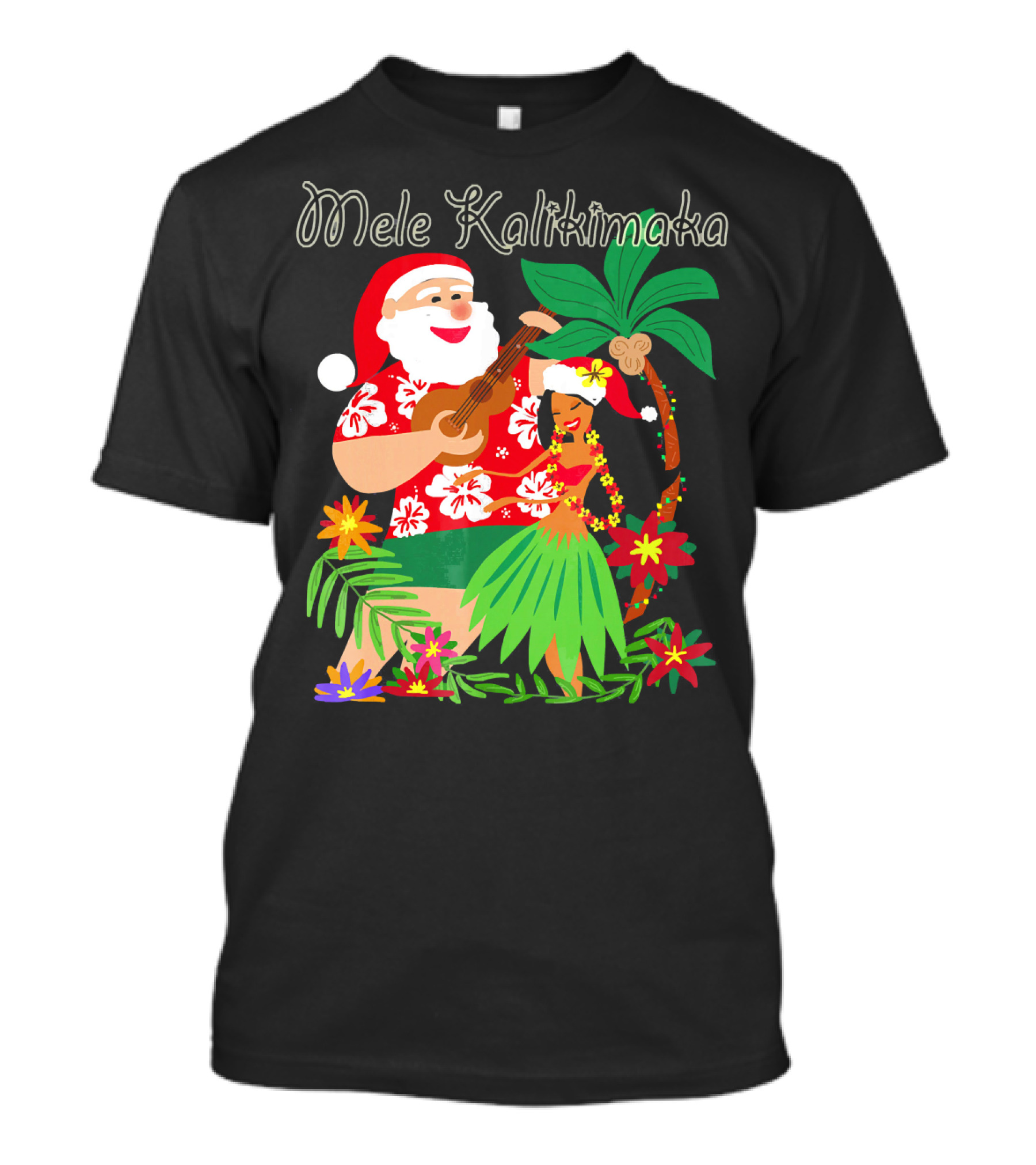 The Mele Kalikimaka Christmas Santa Playing Ukulele with Hula Dancer and Tropical Flowers T-shirt is designed for everyday wear and a consistent fit. Fabric is pre-shrunk ring-spun cotton with durable stitching. See the size chart below for exact measurements.