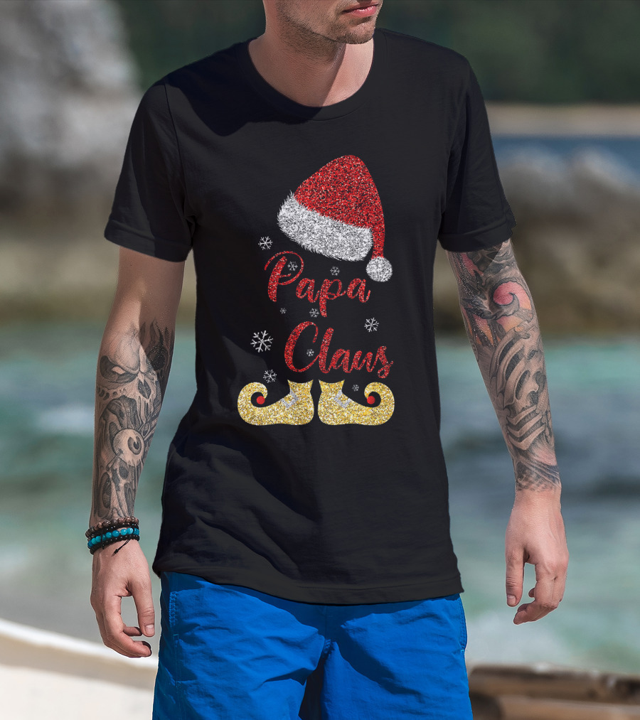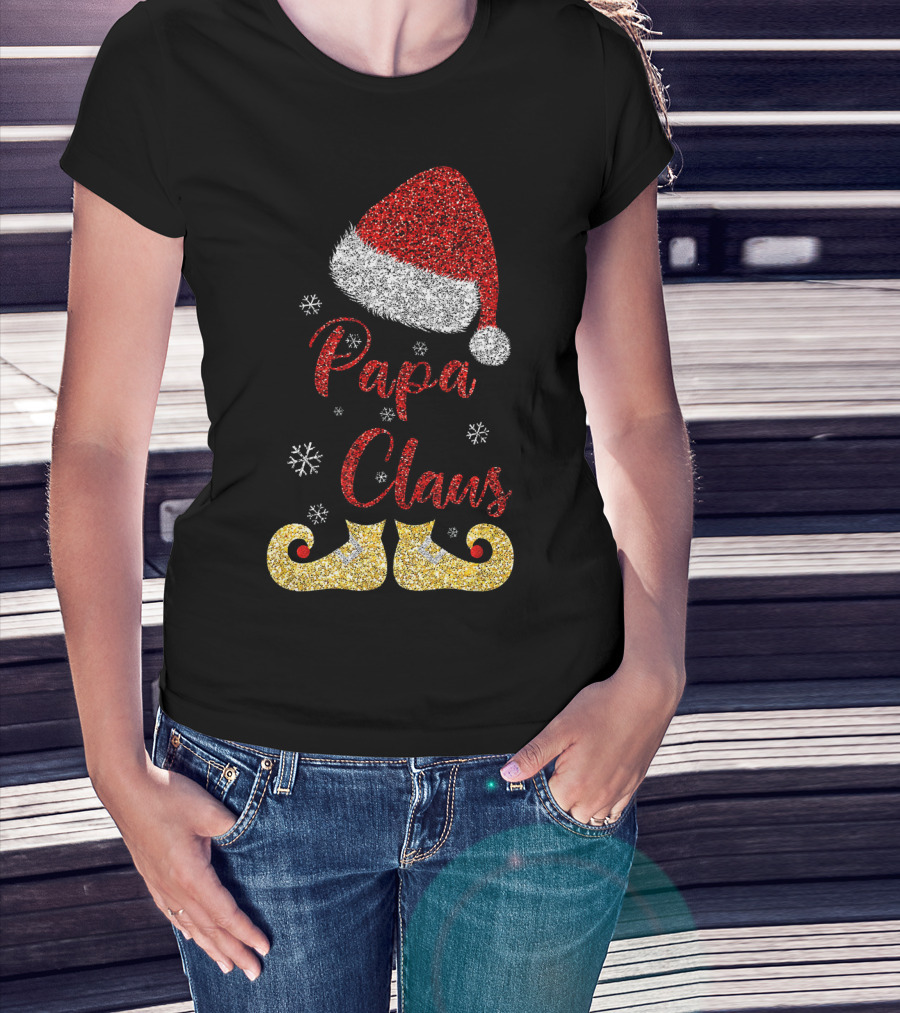Papa Claus Red Santa Hat Snowflakes Gold Elf Shoes Christmas Family Matching T-Shirt