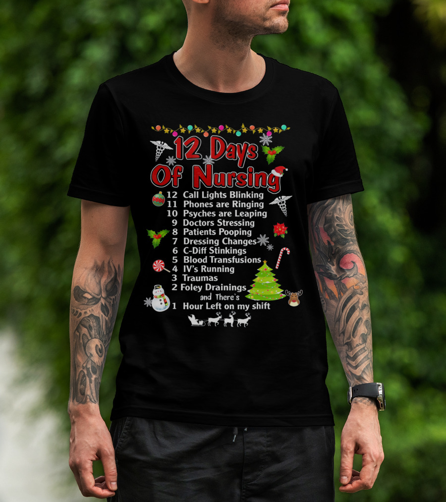 The 12 Days Of Nursing Call Lights Phones Psyches Doctors Patients Dressing C-Diff Blood IV's Traumas Foley Hour Left T-shirt is designed for everyday wear and a consistent fit. Fabric is pre-shrunk ring-spun cotton with durable stitching. See the size chart below for exact measurements.