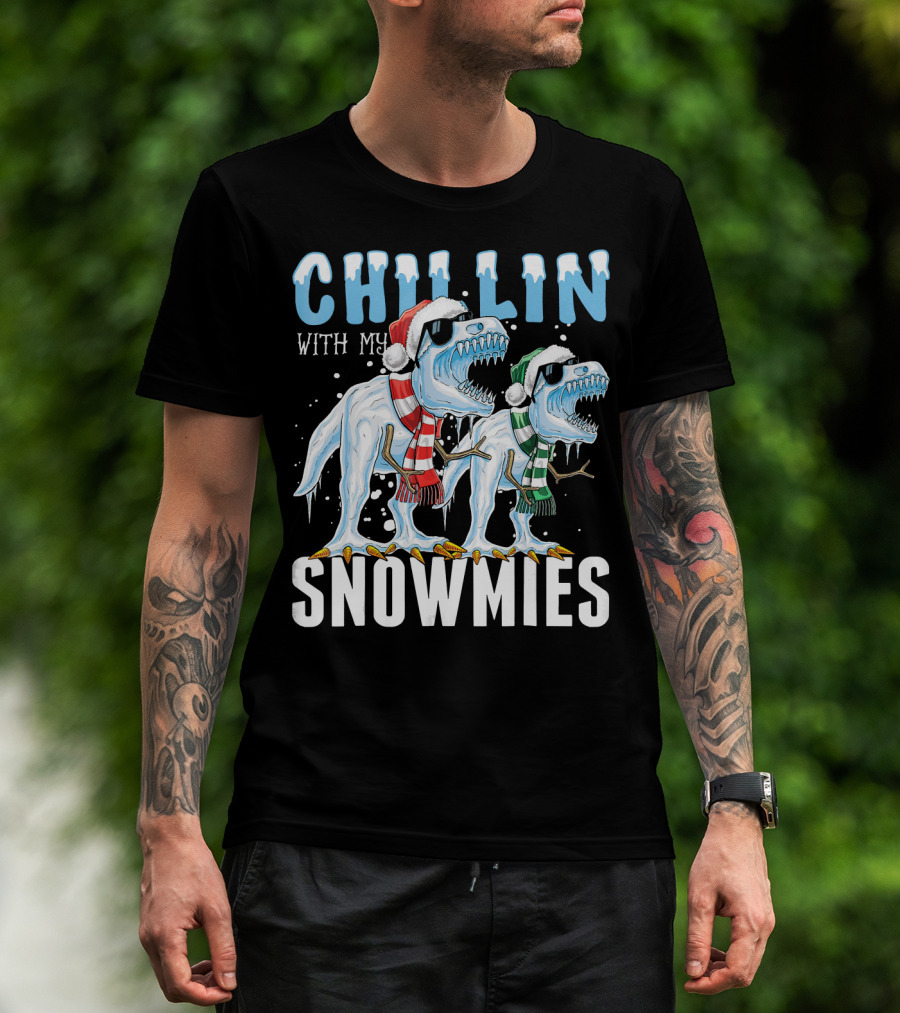 Chillin With My Snowmies Christmas Dinos Santa Hat Scarves Sunglasses Festive Fun T-Shirt