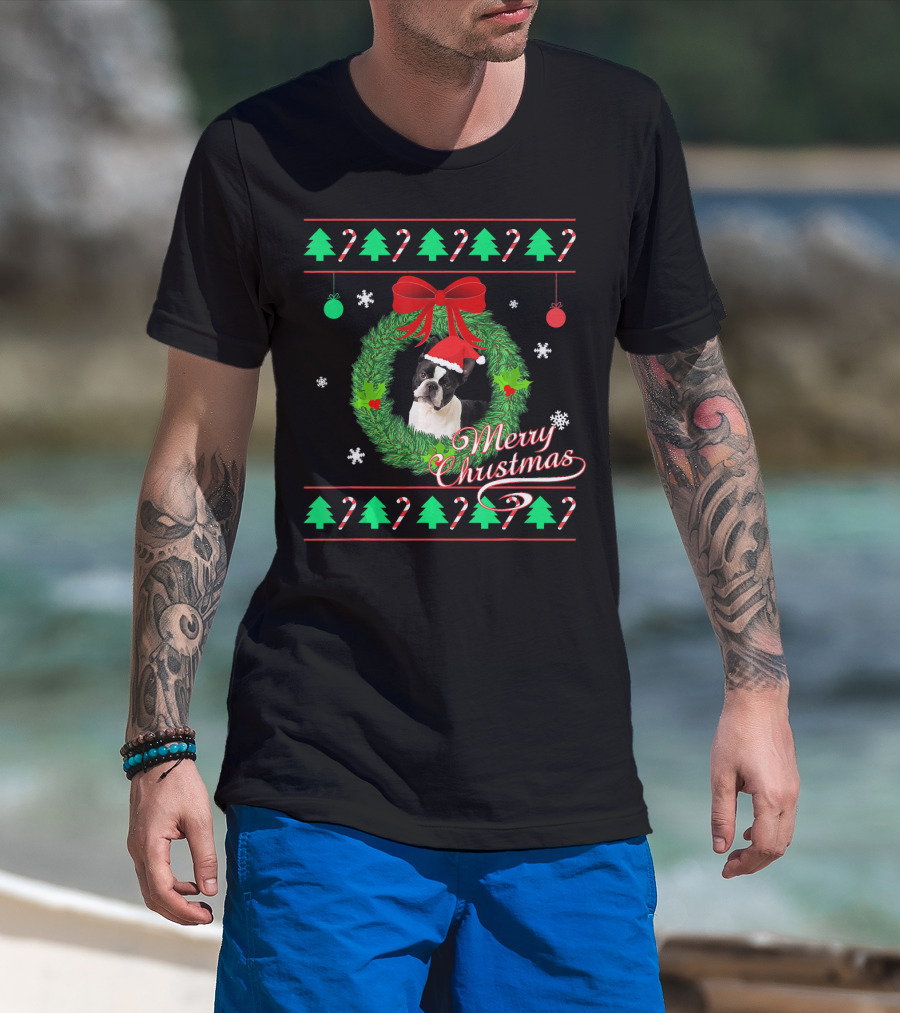 Merry Christmas Boston Terrier Wreath Candy Cane Trees T-Shirt
