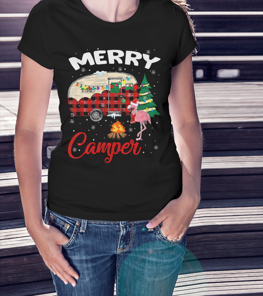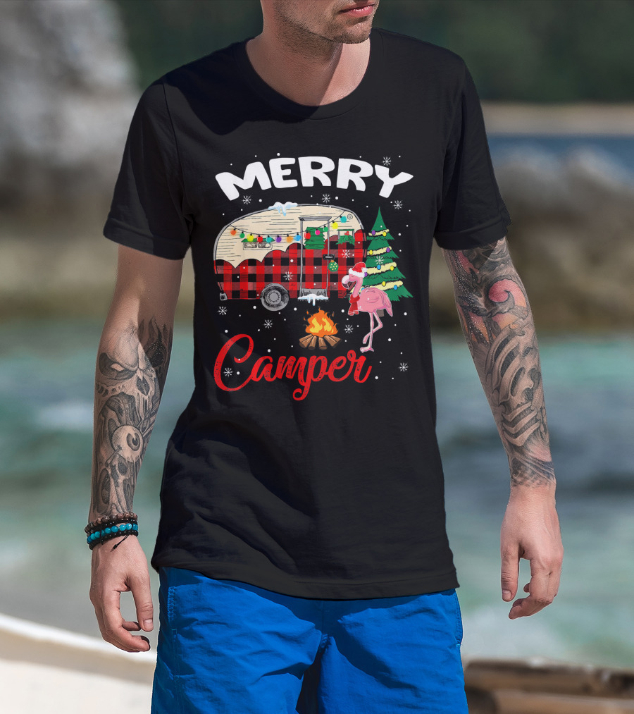 Merry Camper Christmas Camping Flamingo And Campfire Scene T-Shirt