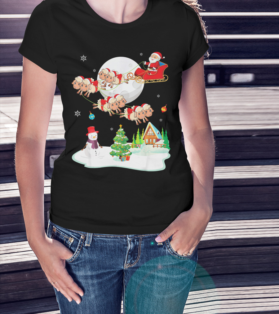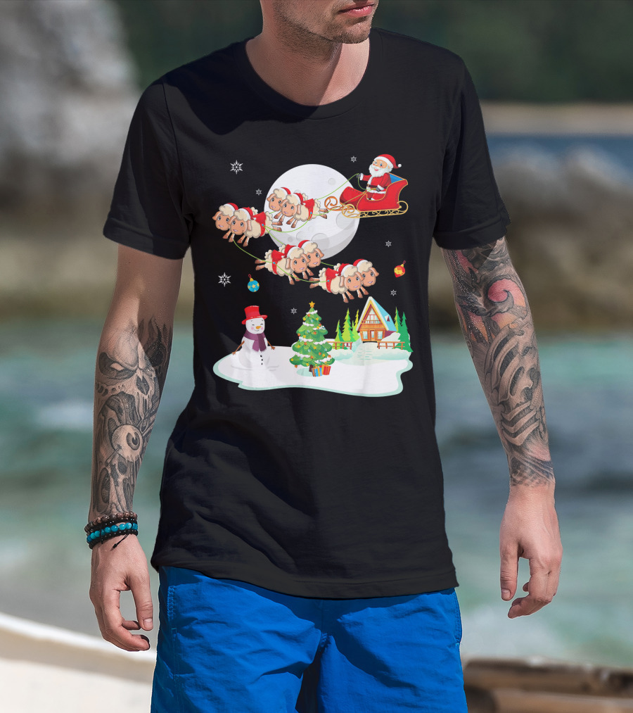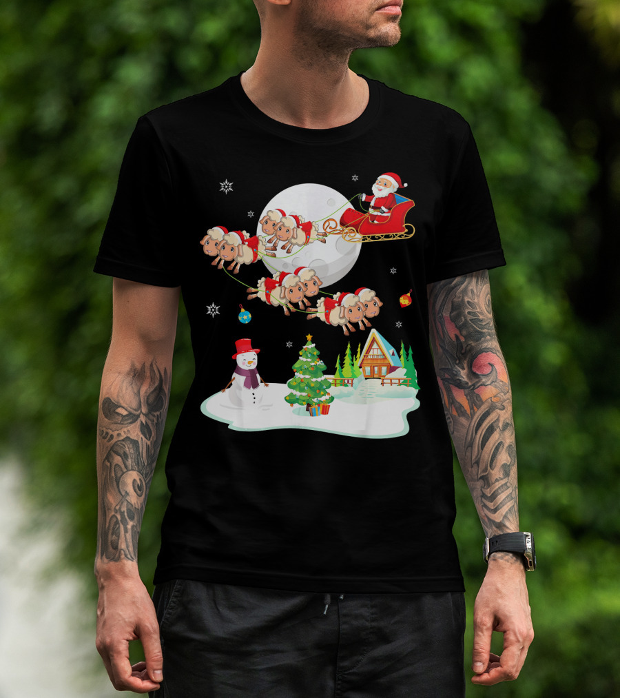 Santa Noel With Dancing Snowman And Sheep Sleigh By Moon T-Shirt