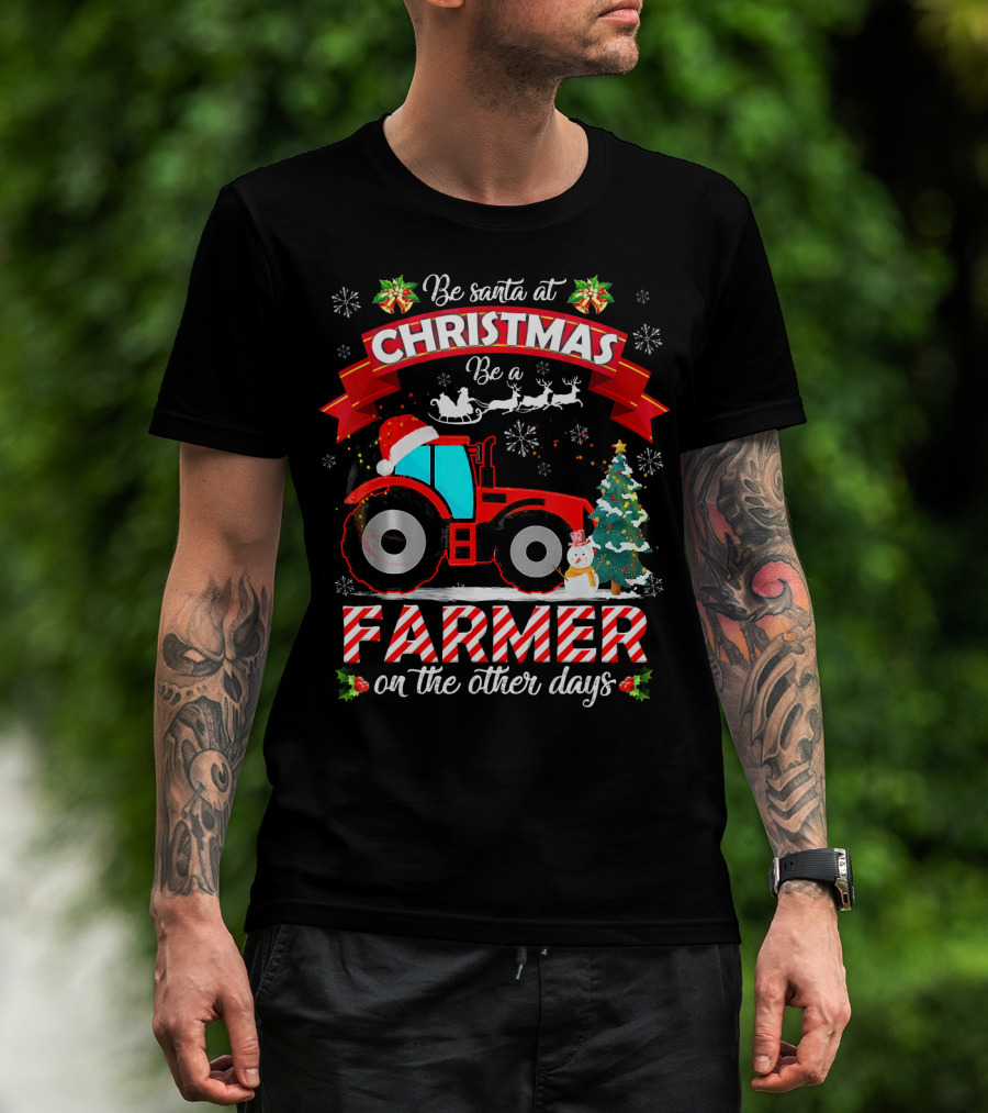 Be Santa At Christmas Be A Farmer On The Other Days Tractor Sleigh Snowflakes Tree T-Shirt