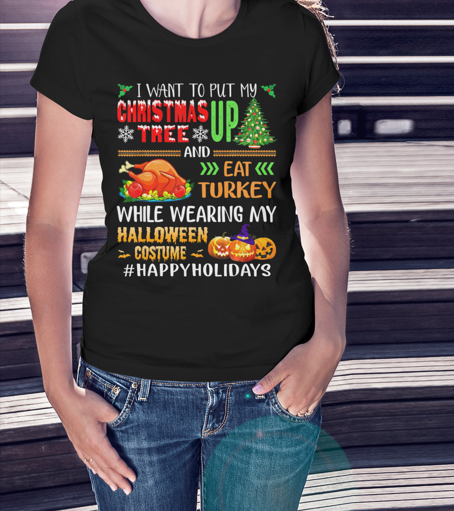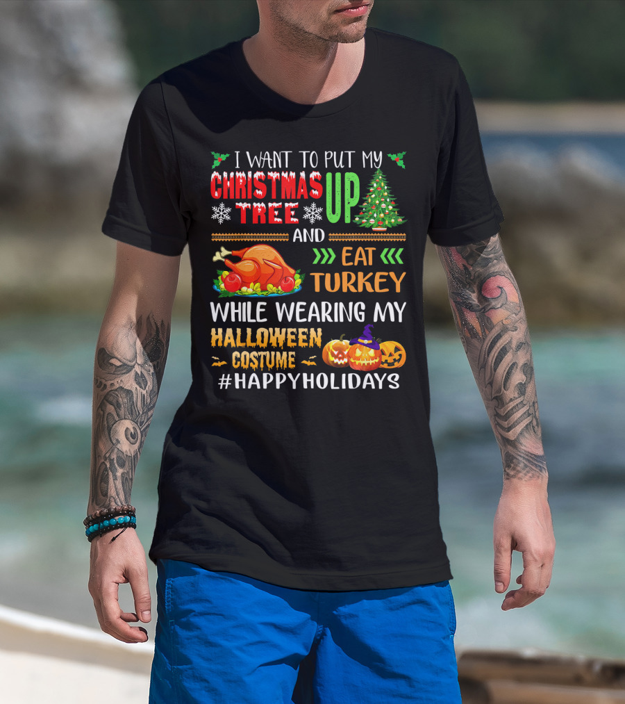 I Want To Put My Christmas Tree Up And Eat Turkey While Wearing My Halloween Costume #HappyHolidays T-Shirt