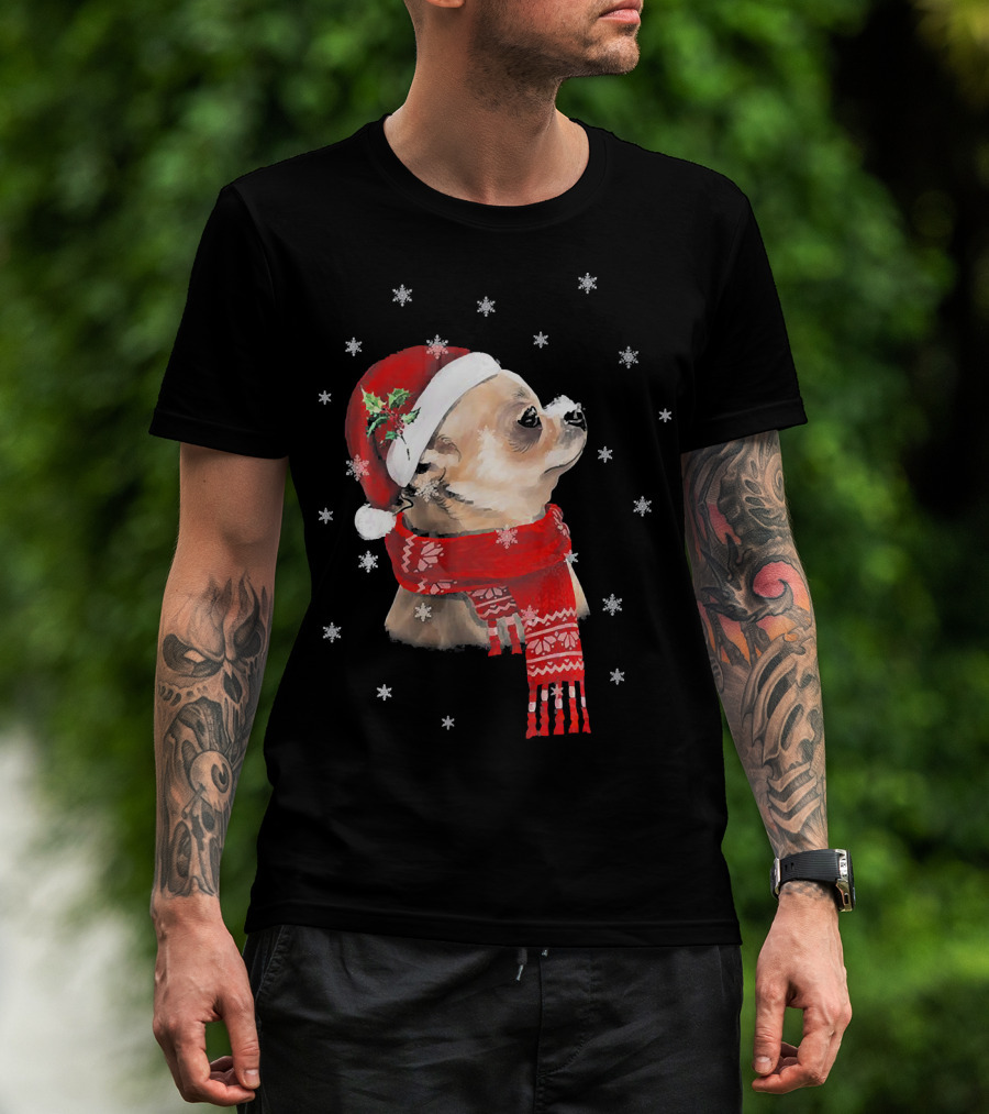 Chihuahua Christmas Cute Chihuahua Lover Festive Santa Hat And Scarf Snowflakes T-Shirt