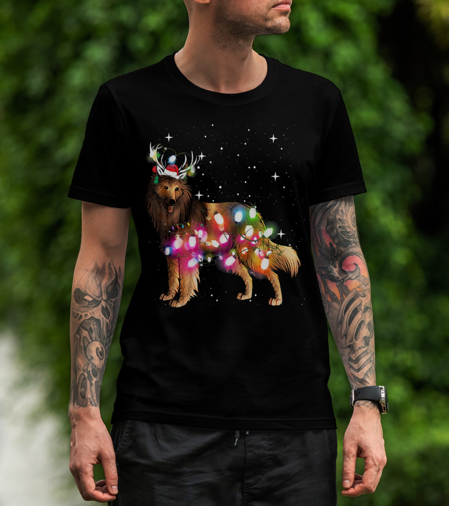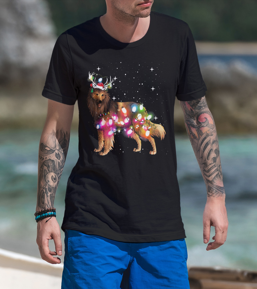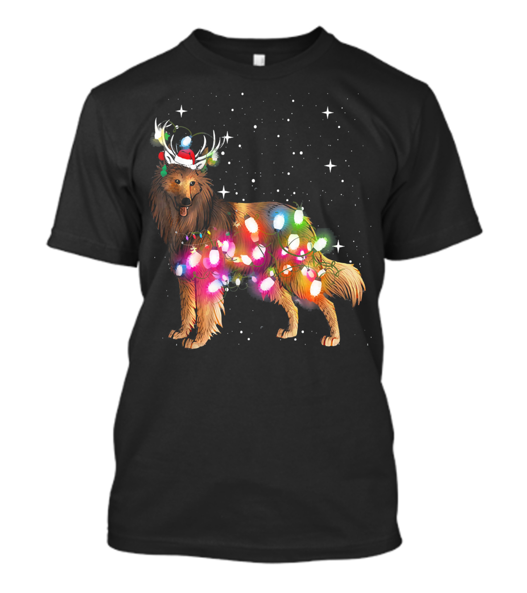 Belgian Tervuren Dog Wrapped In Christmas Lights With Santa Hat And Antlers T-Shirt