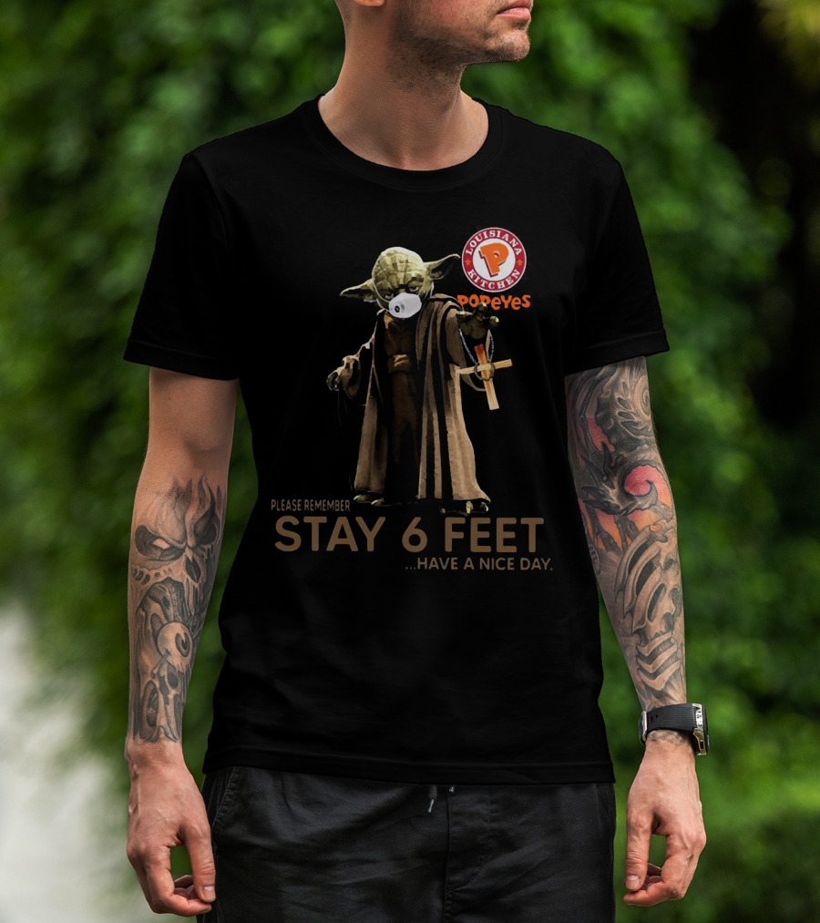 The Please Remember Stay 6 Feet Yoda Mask Popeyes Louisiana Kitchen T-shirt is designed for everyday wear and a consistent fit. Fabric is pre-shrunk ring-spun cotton with durable stitching. See the size chart below for exact measurements.