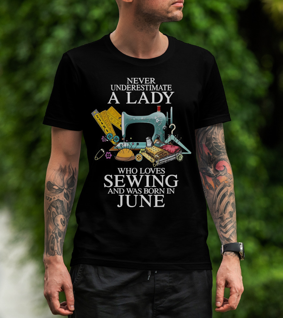 Never Underestimate A Lady Who Loves Sewing And Was Born In June With A Vintage Sewing Machine Background T-Shirt