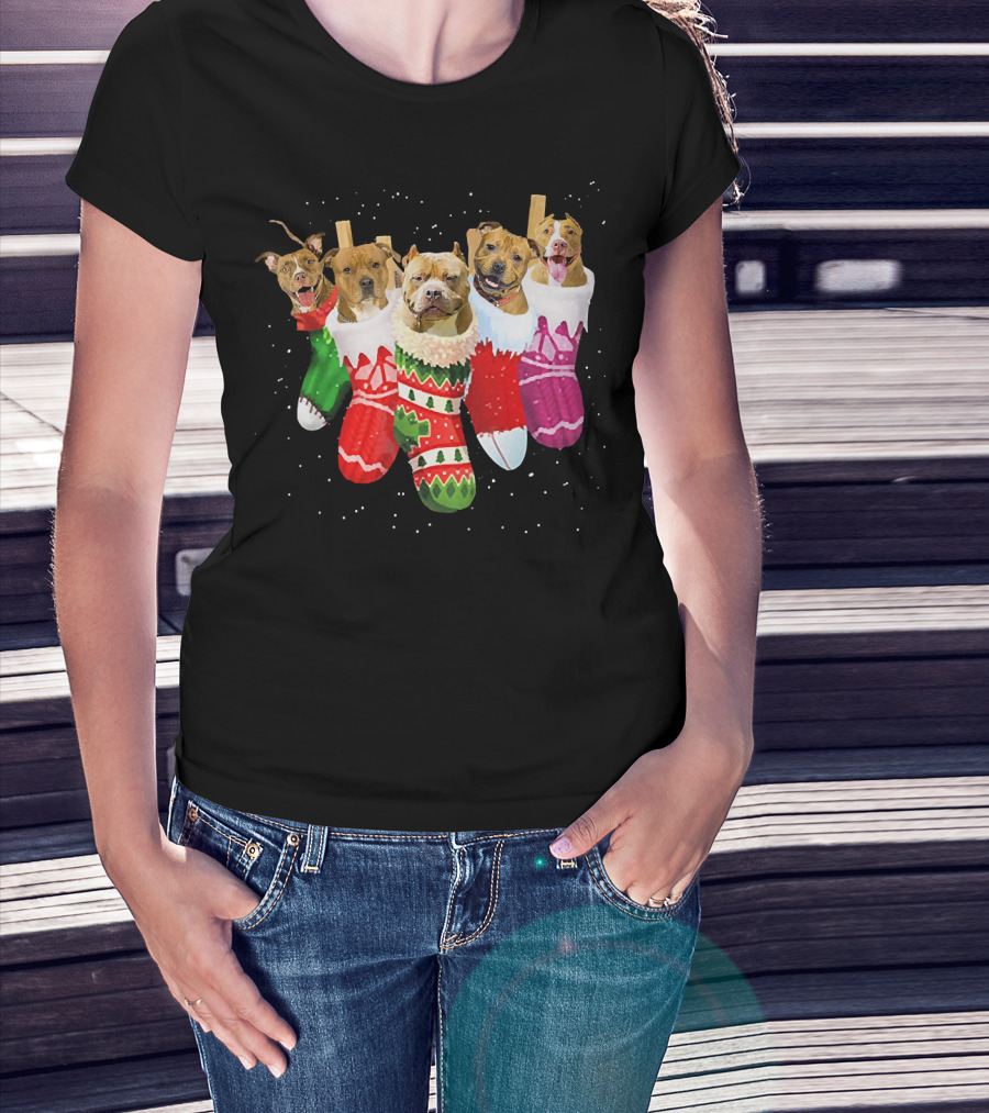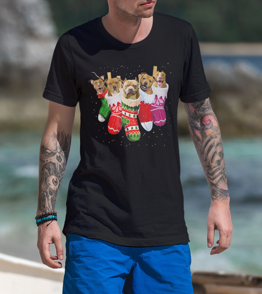 Pit Bull Dogs In Festive Christmas Stockings T-Shirt