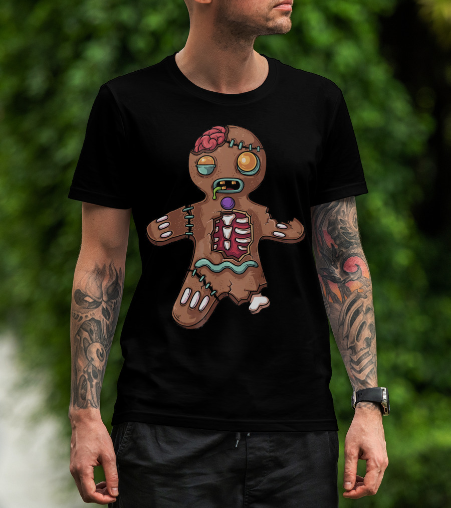 The Zombie Christmas Gingerbread Man with Exposed Brain and Candy Bones T-shirt is designed for everyday wear and a consistent fit. Fabric is pre-shrunk ring-spun cotton with durable stitching. See the size chart below for exact measurements.