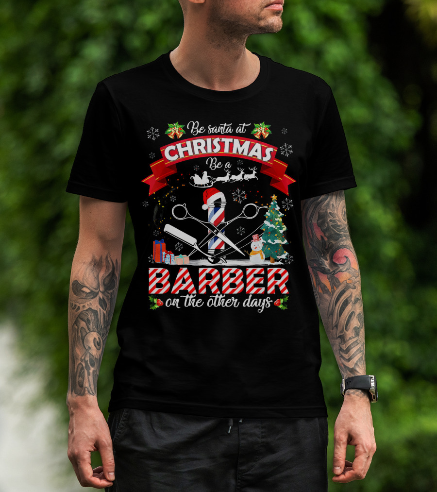 Be Santa At Christmas Be A Barber On The Other Days Christmas Holiday Barber Shop Slogan With Santa Hat And Decorations T-Shirt