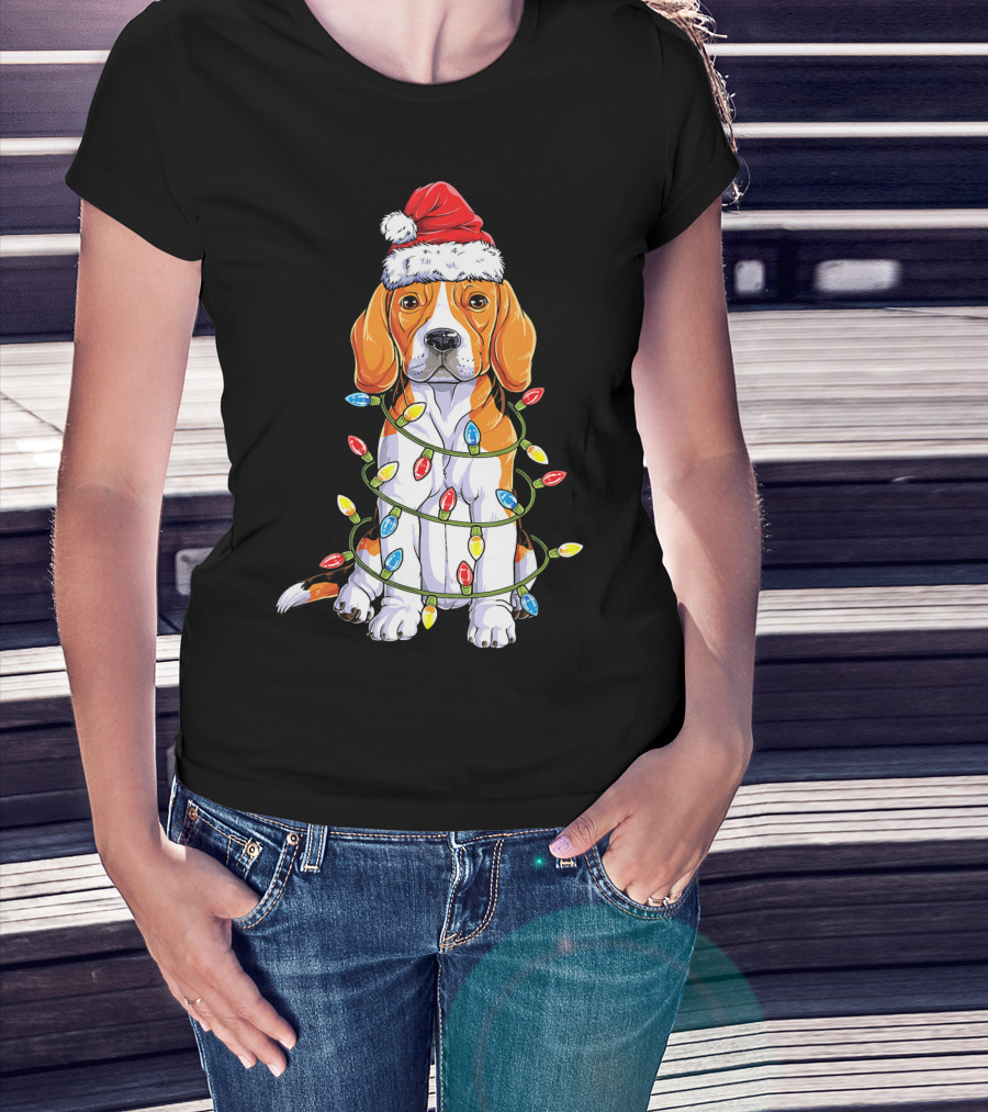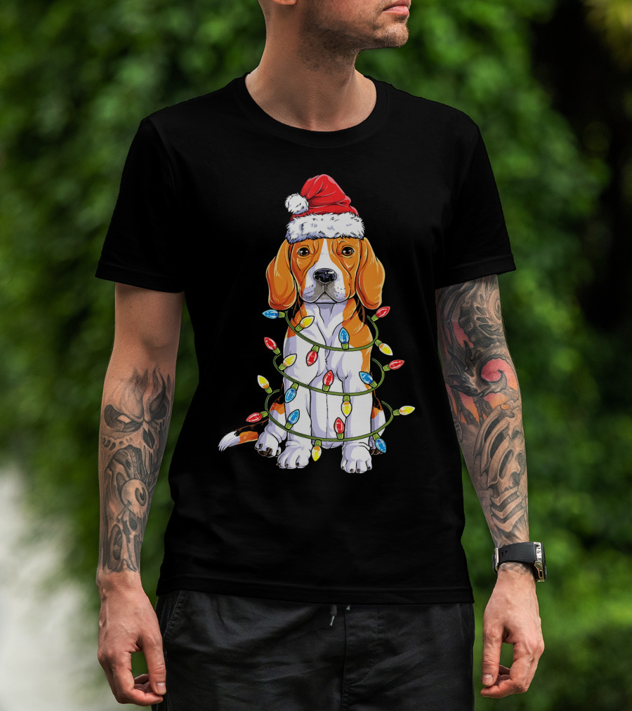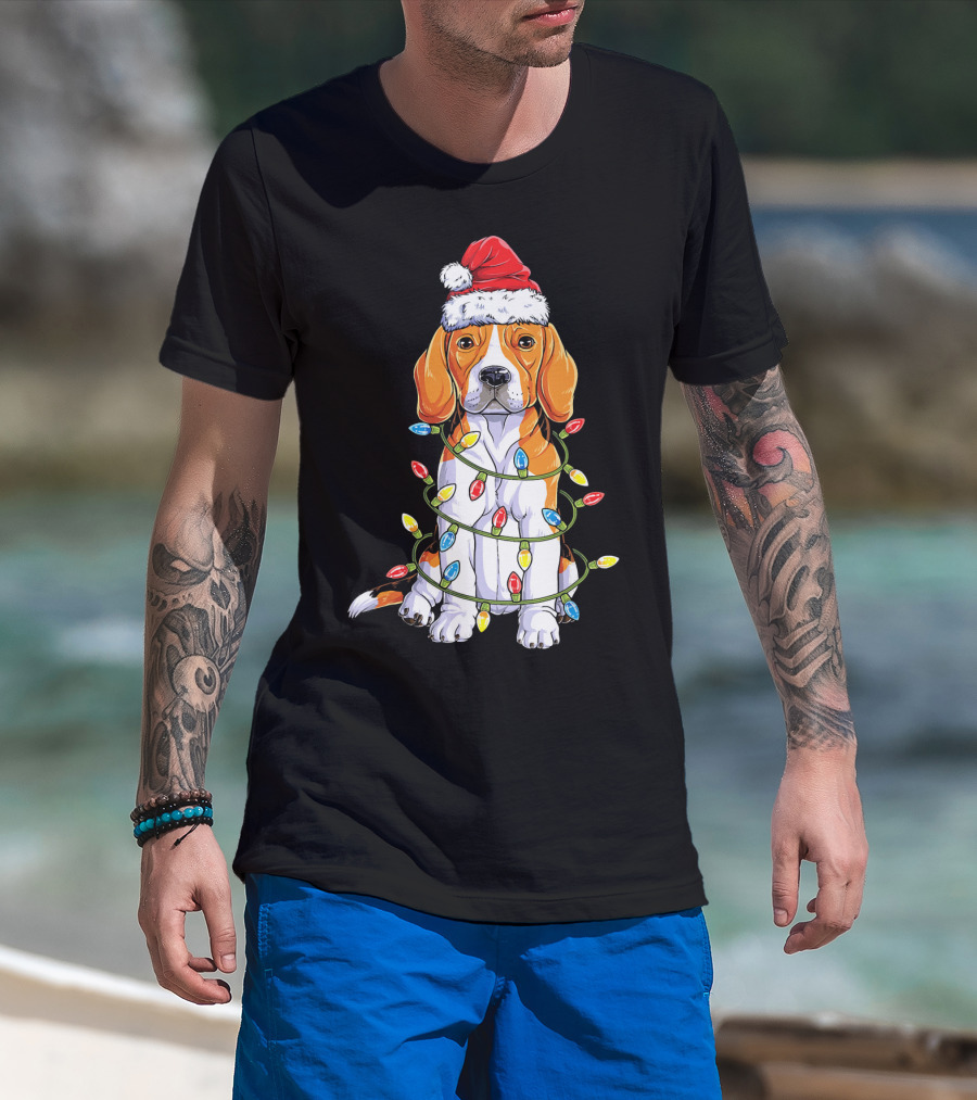 Beagle Wrapped In Christmas Lights With Santa Hat T-Shirt