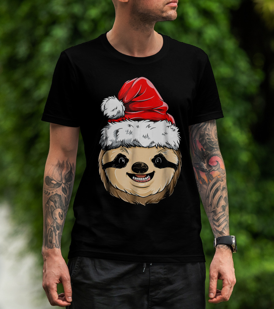 Sloth Santa Christmas Hat Cheerful Face T-Shirt
