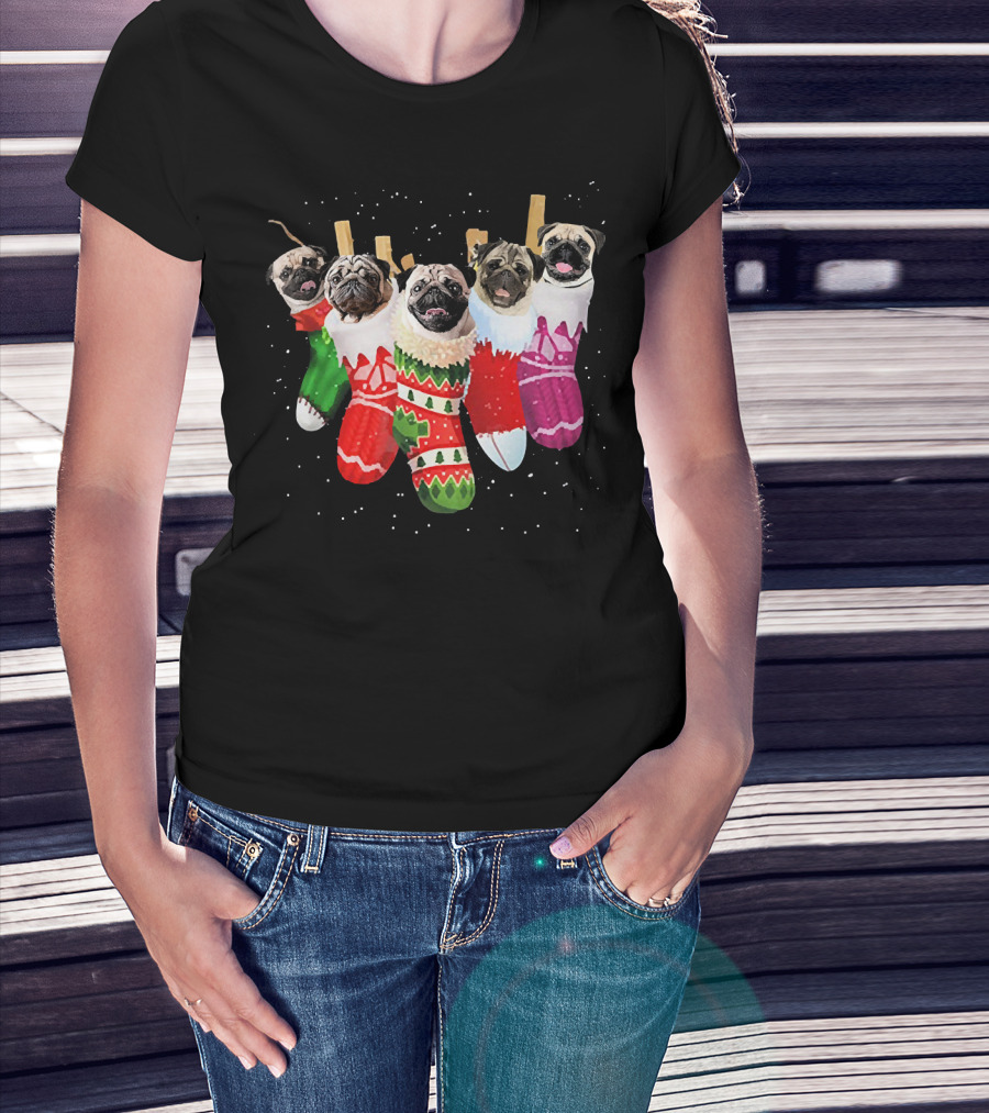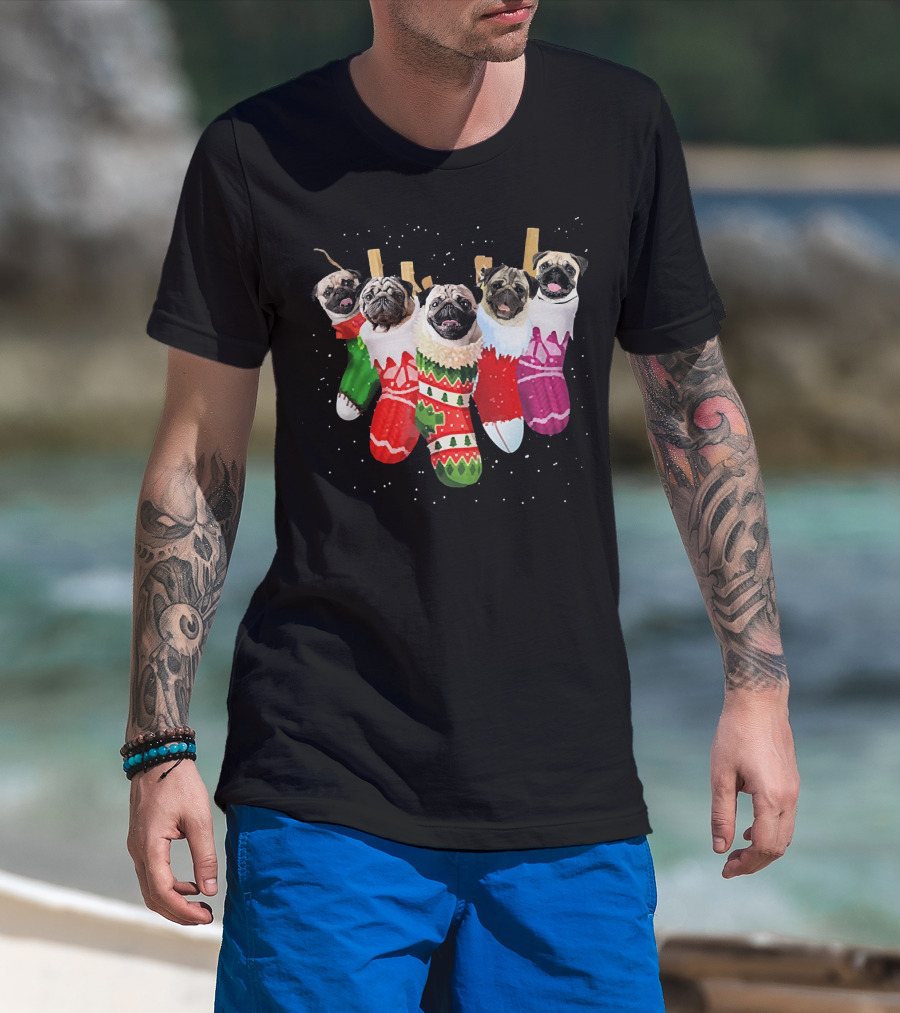 Pug Heads In Colorful Christmas Stockings With Snowflakes T-Shirt