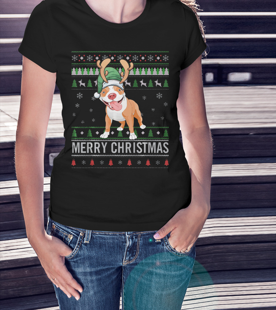 Merry Christmas Pitbull Dog Reindeer Antlers Festive T-Shirt