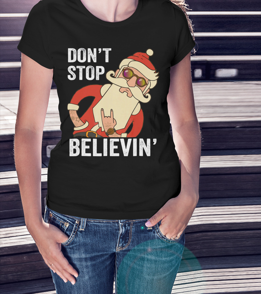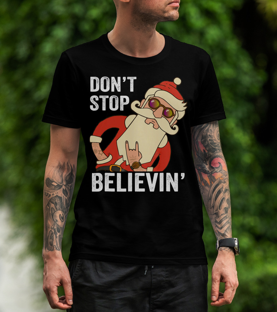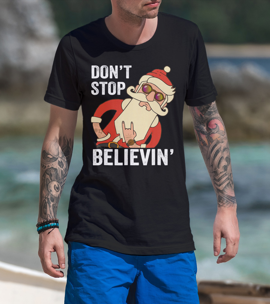 DON'T STOP BELIEVIN' SANTA ROCK HAND GESTURE T-Shirt