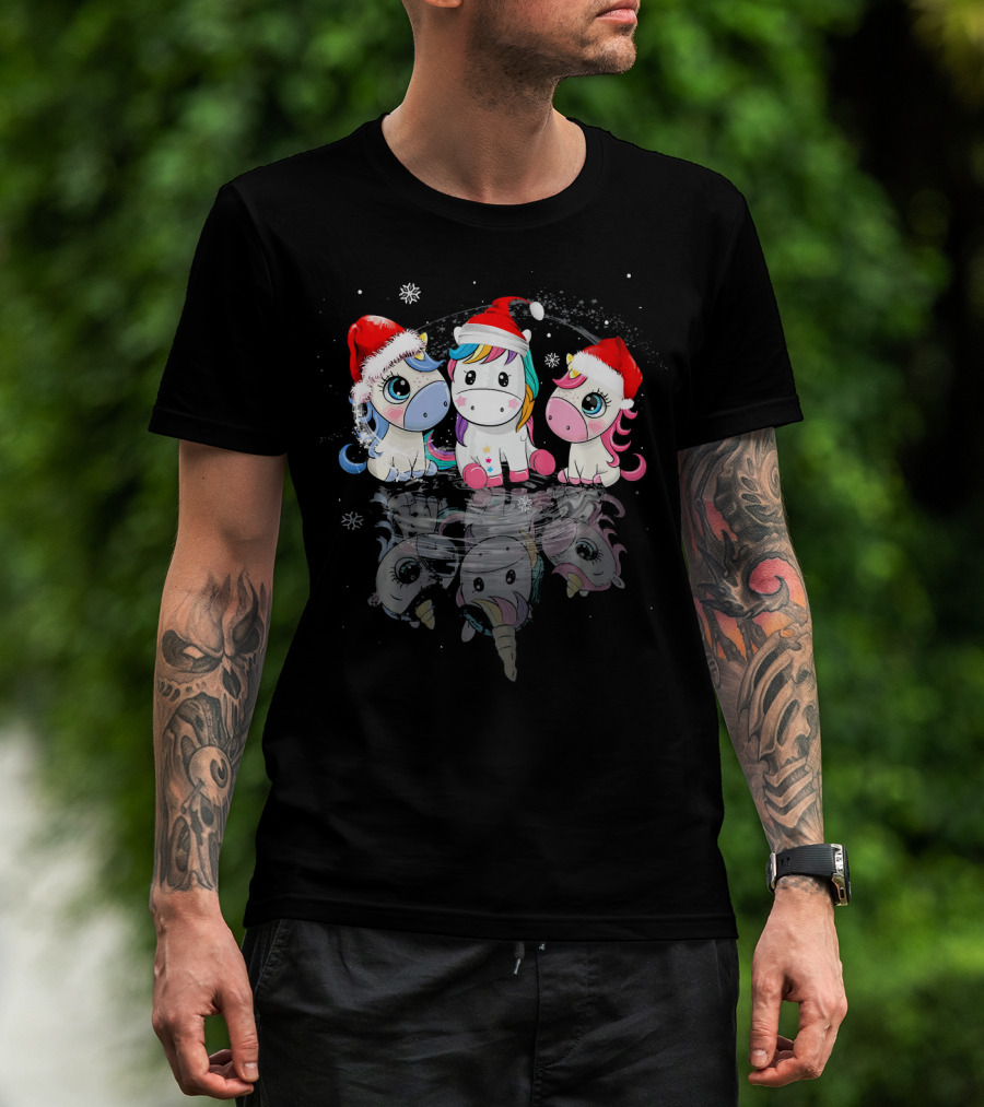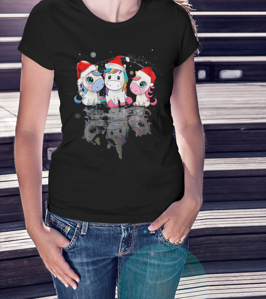 Christmas Santa Hat Funny Three Cute Unicorn Snowflakes T-Shirt