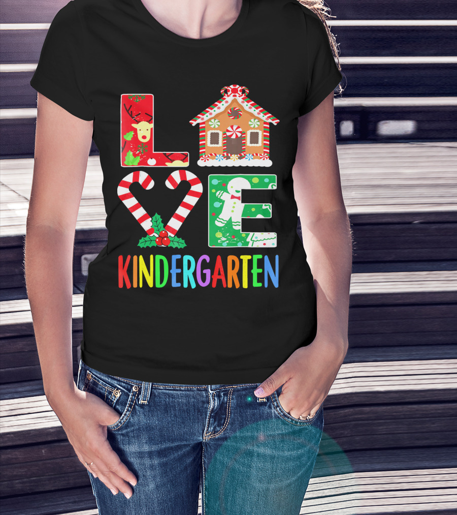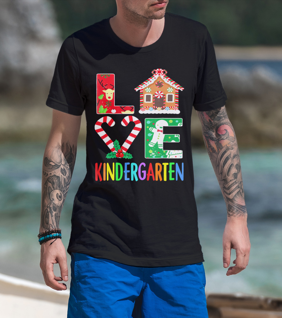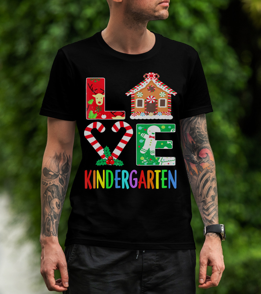 LOVE Kindergarten Christmas Reindeer Gingerbread Candy Cane T-Shirt