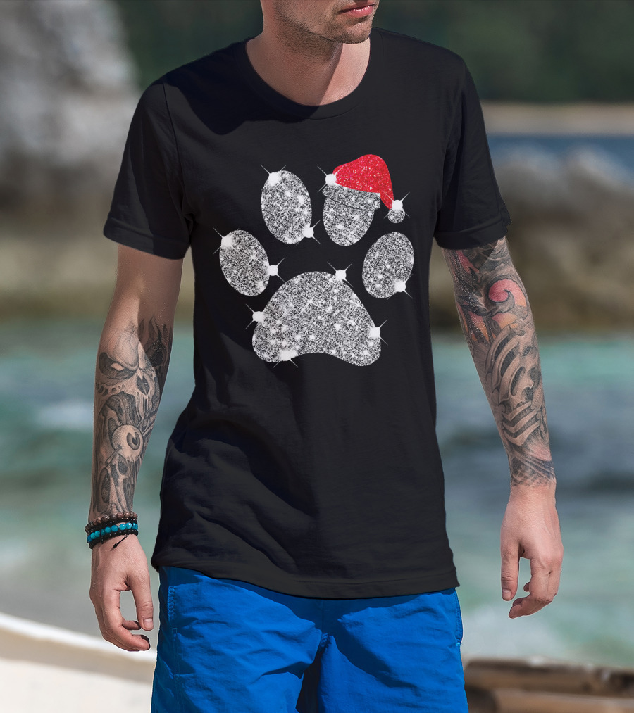 Merry Christmas Paw Santa Hat Sparkle T-Shirt