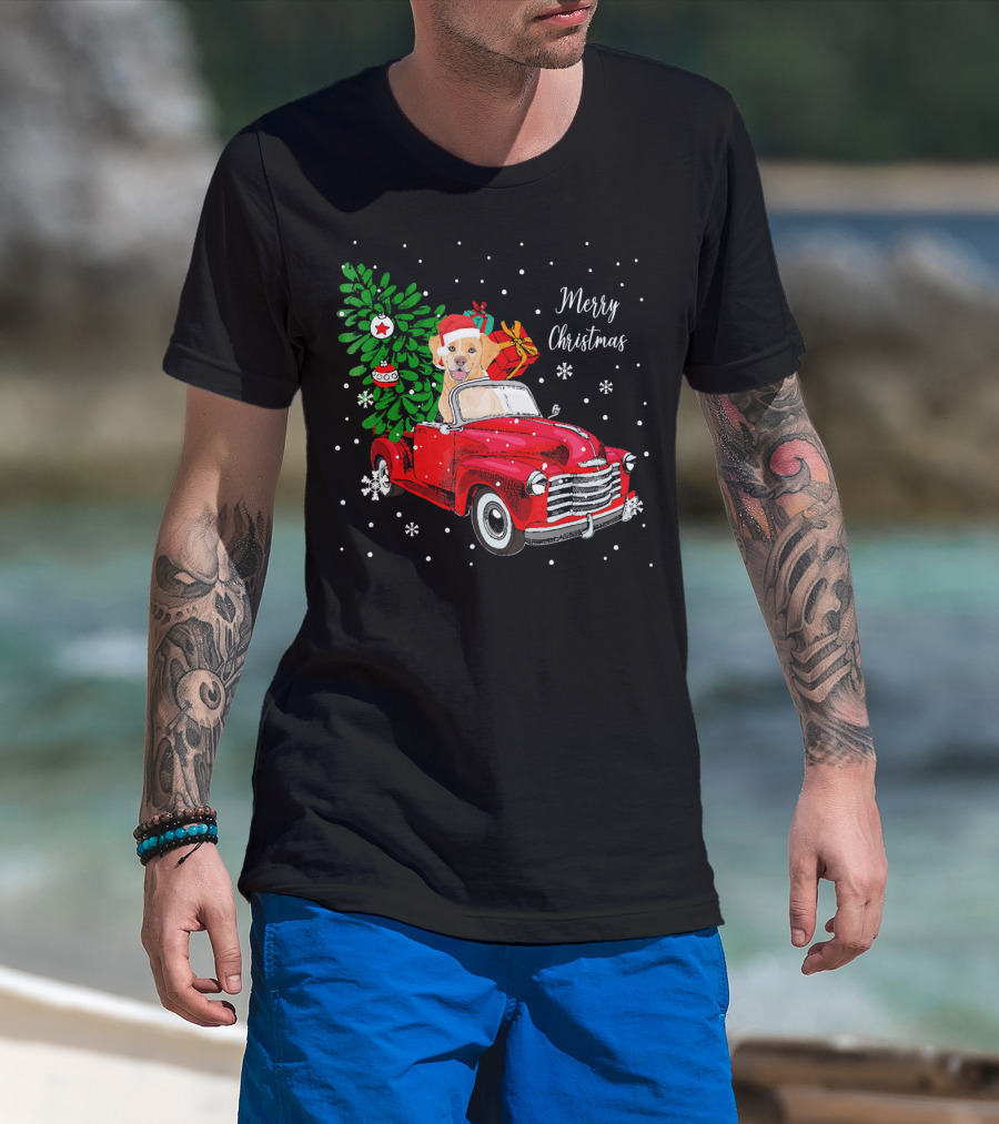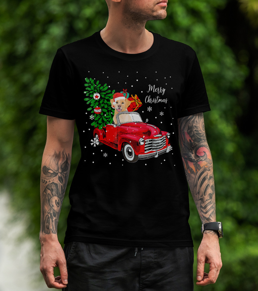 Merry Christmas Santa Labrador Dog Riding Red Truck With Presents And Tree T-Shirt