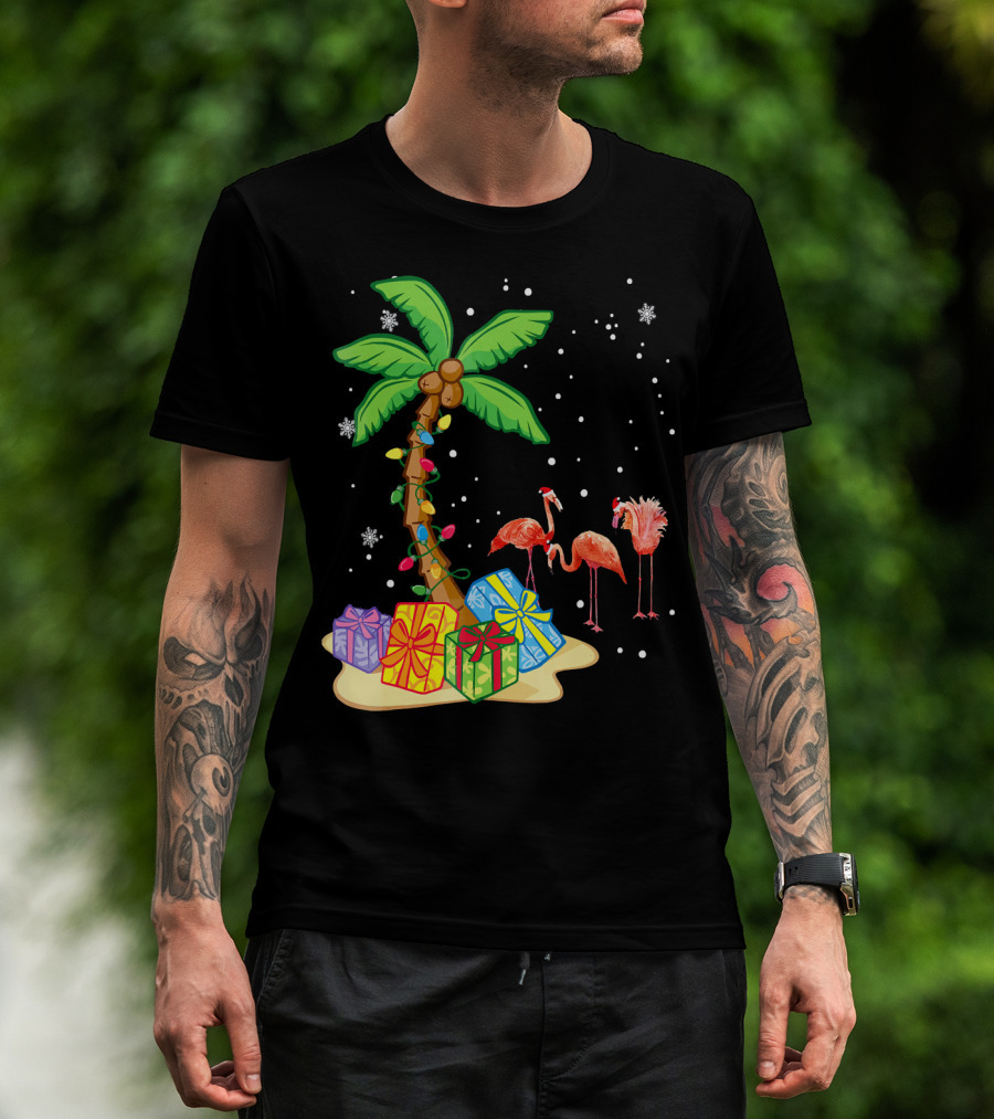 Flamingo Christmas Palm Tree Snow Presents T-Shirt