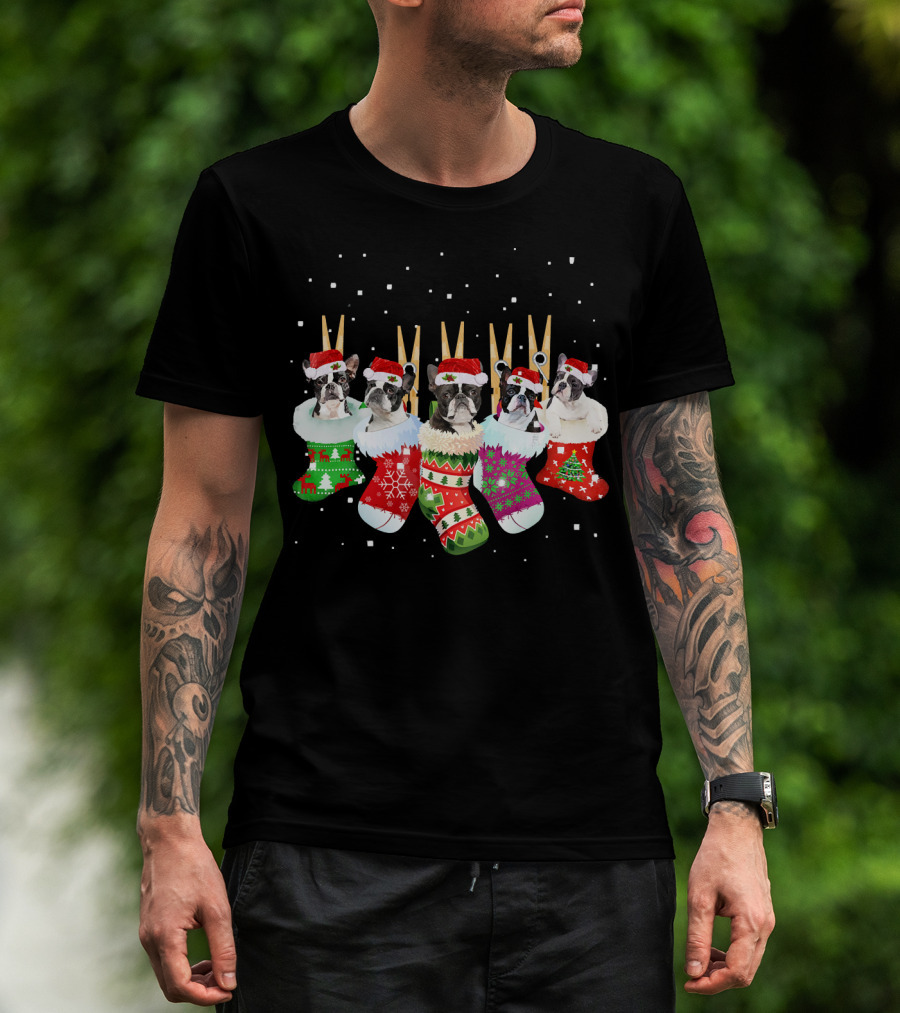 Christmas Boston Terrier Santa Hat Stockings T-Shirt