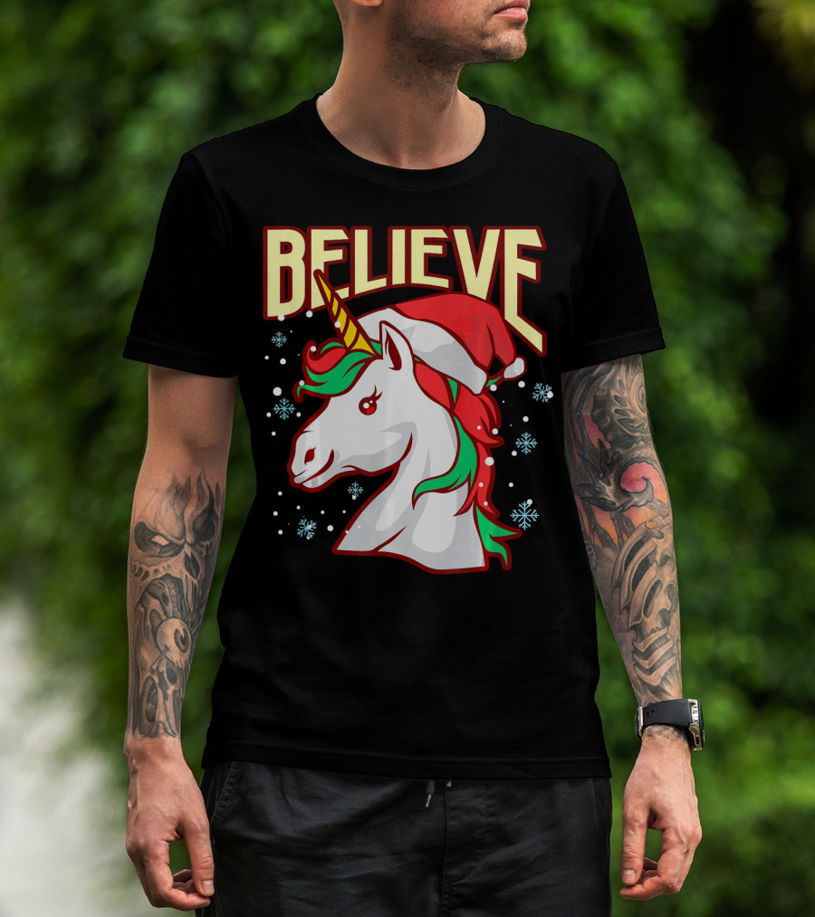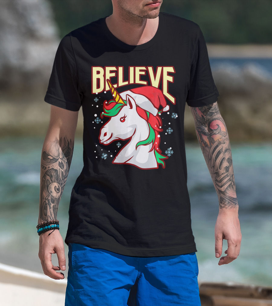 Believe The Unicorn Santa Hat Snowflakes T-Shirt