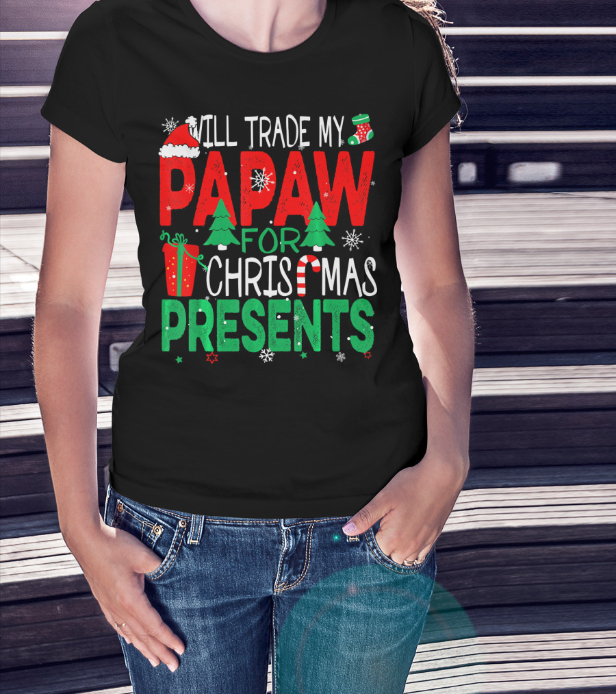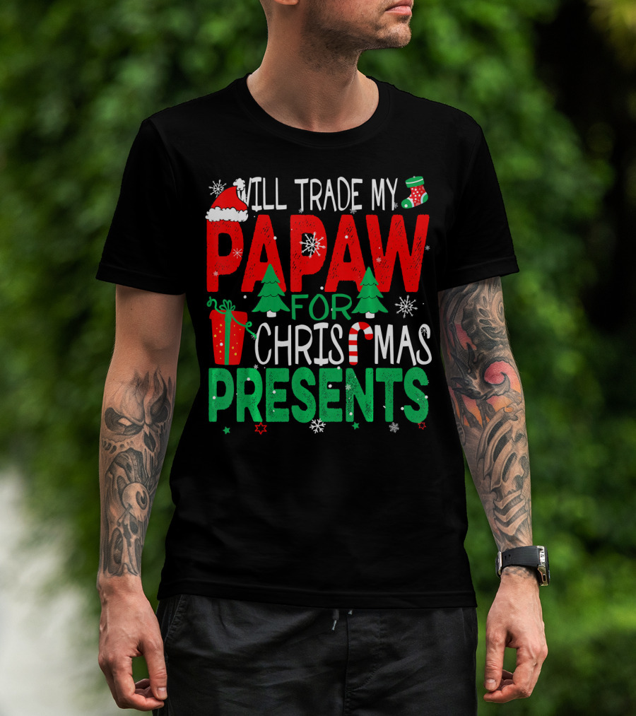 Will Trade My Papaw For Christmas Presents Santa Hat Stocking Candy Cane Snowflakes T-Shirt