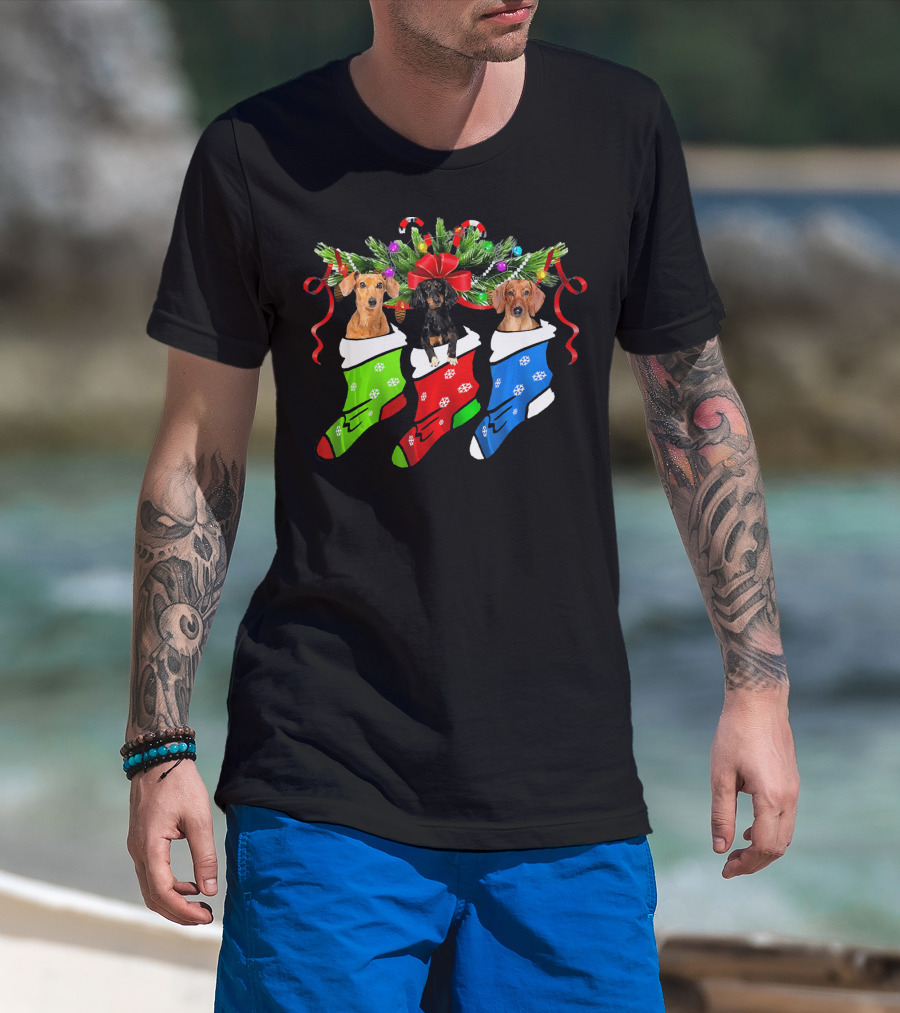 Funny Christmas Three Dachshund In Sock With Red Green Blue Holiday Stockings T-Shirt