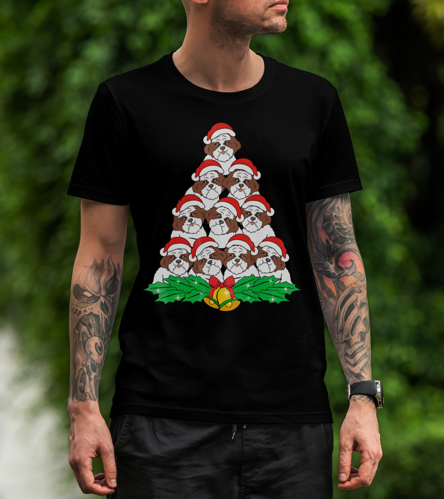 Shih Tzu Christmas Tree Dog Santa Hat Bells Holly Xmas Lover T-Shirt