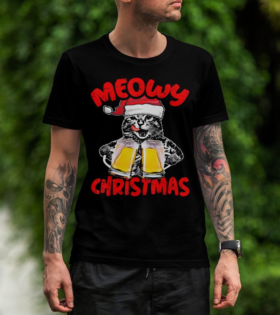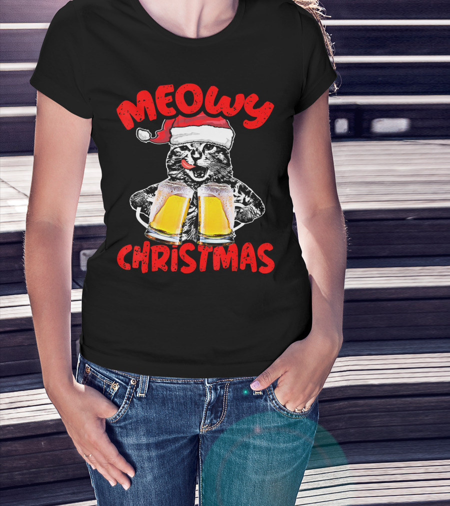 Meowy Christmas Funny Meow Drinking Beer Cat T-Shirt