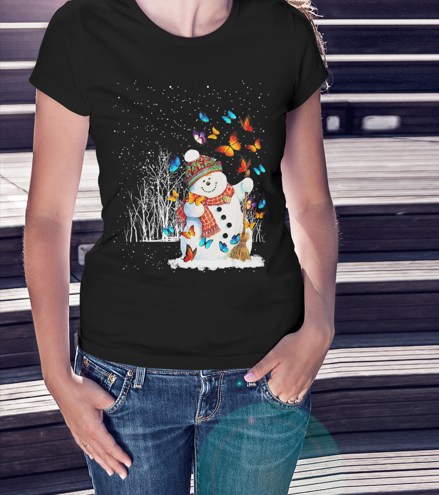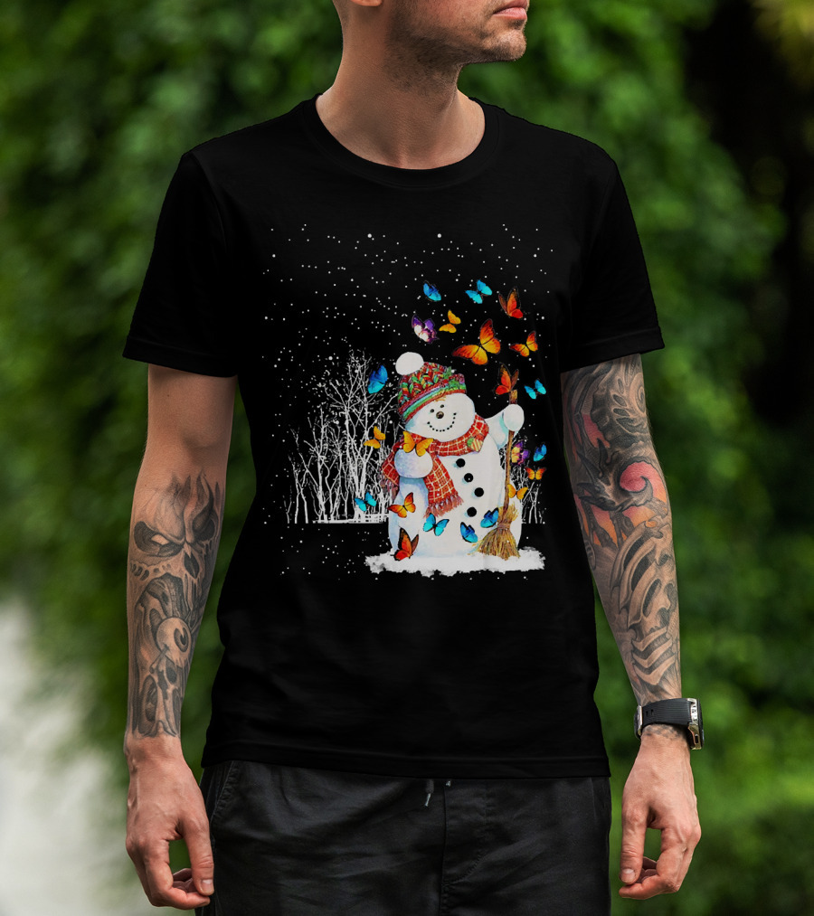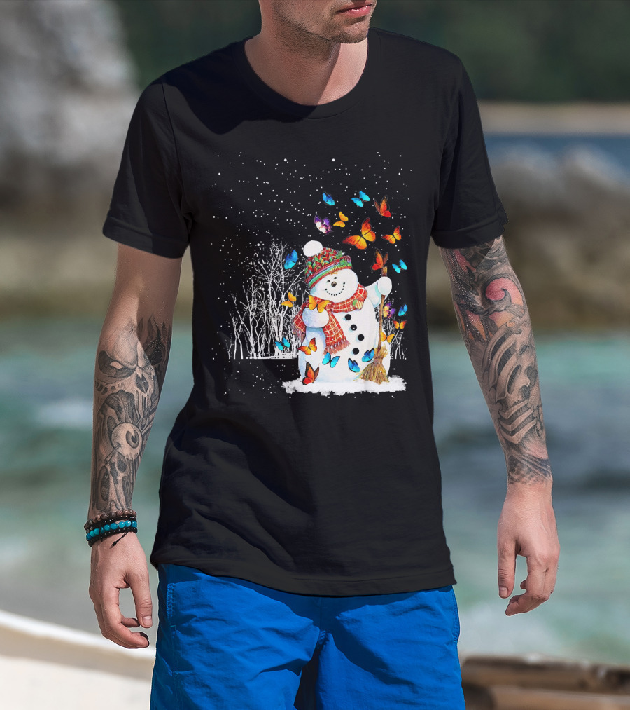 Snowman With Butterflies In A Snowy Forest T-Shirt