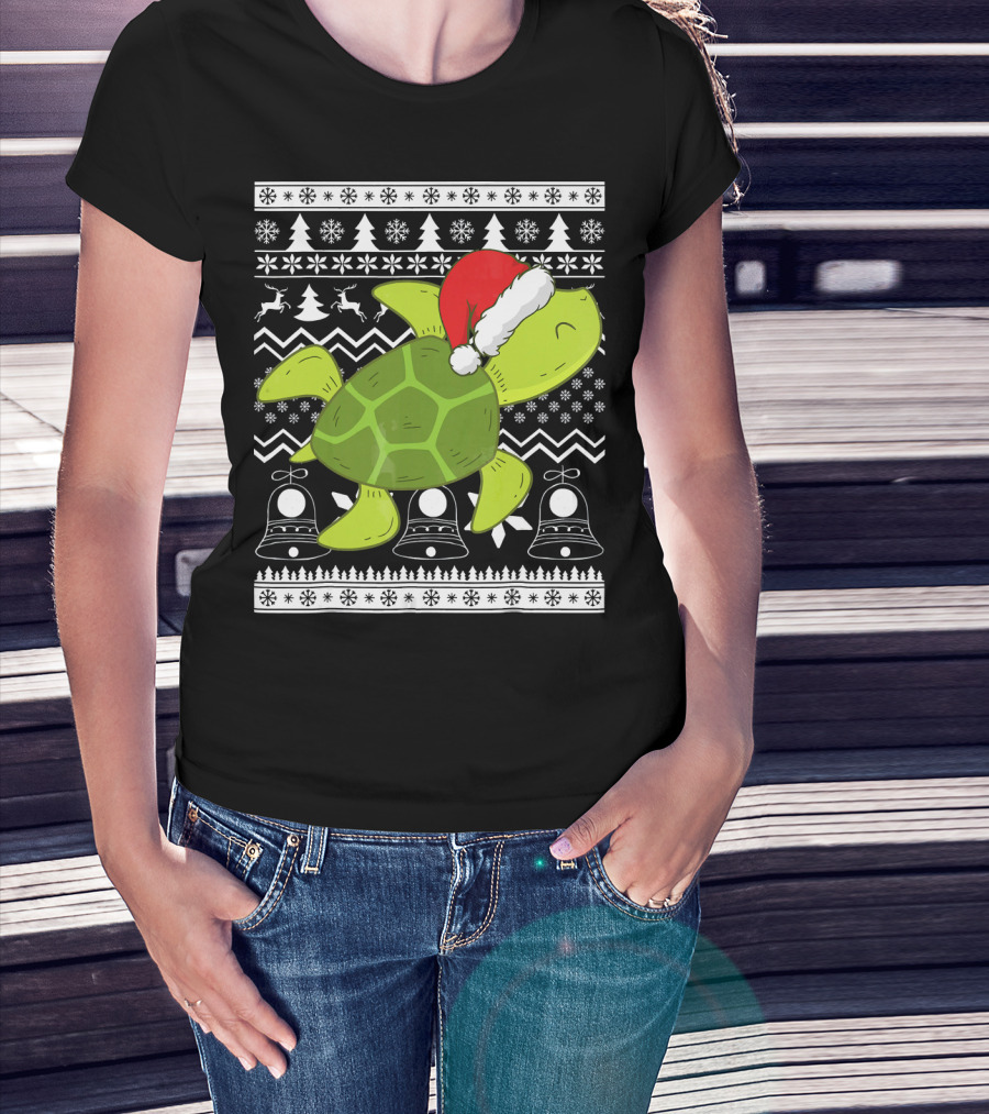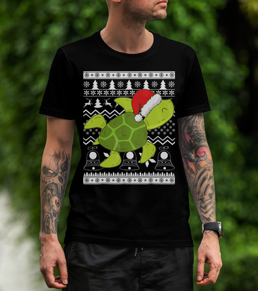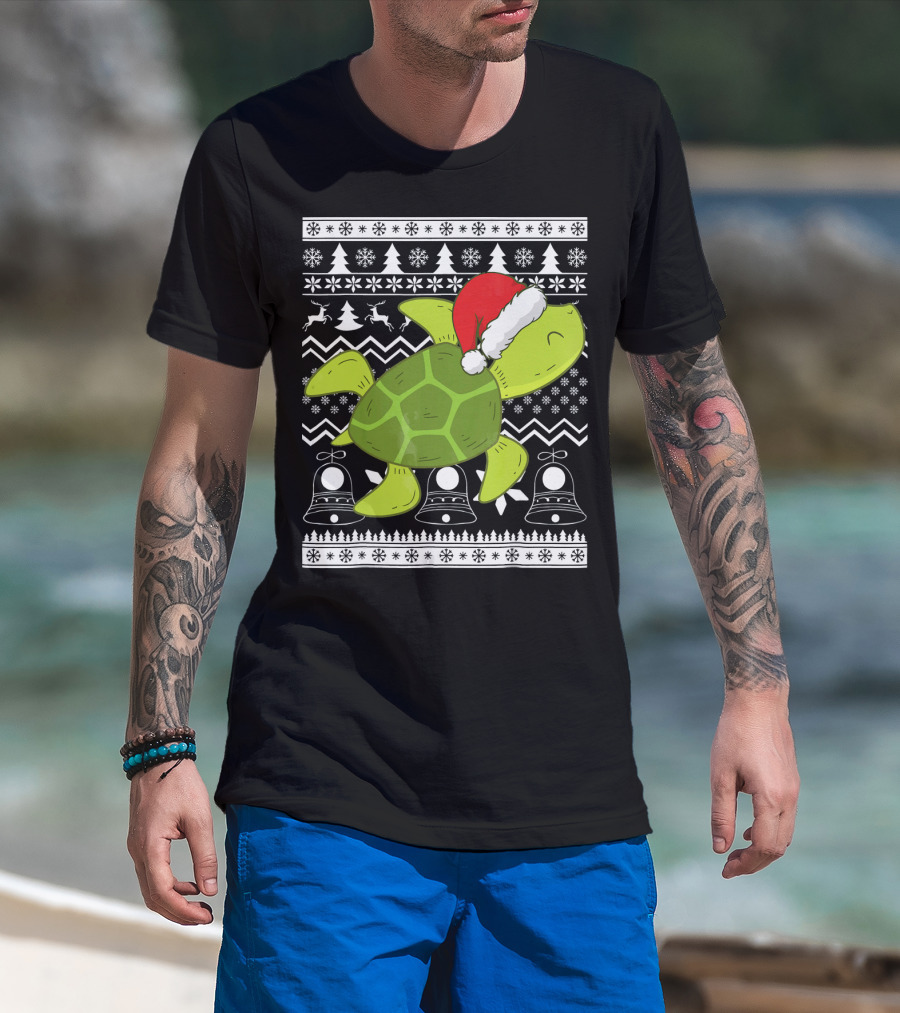 Sea Turtle Santa Holiday Sweater Design With Christmas Bells, Reindeer, Trees, And Snowflakes T-Shirt