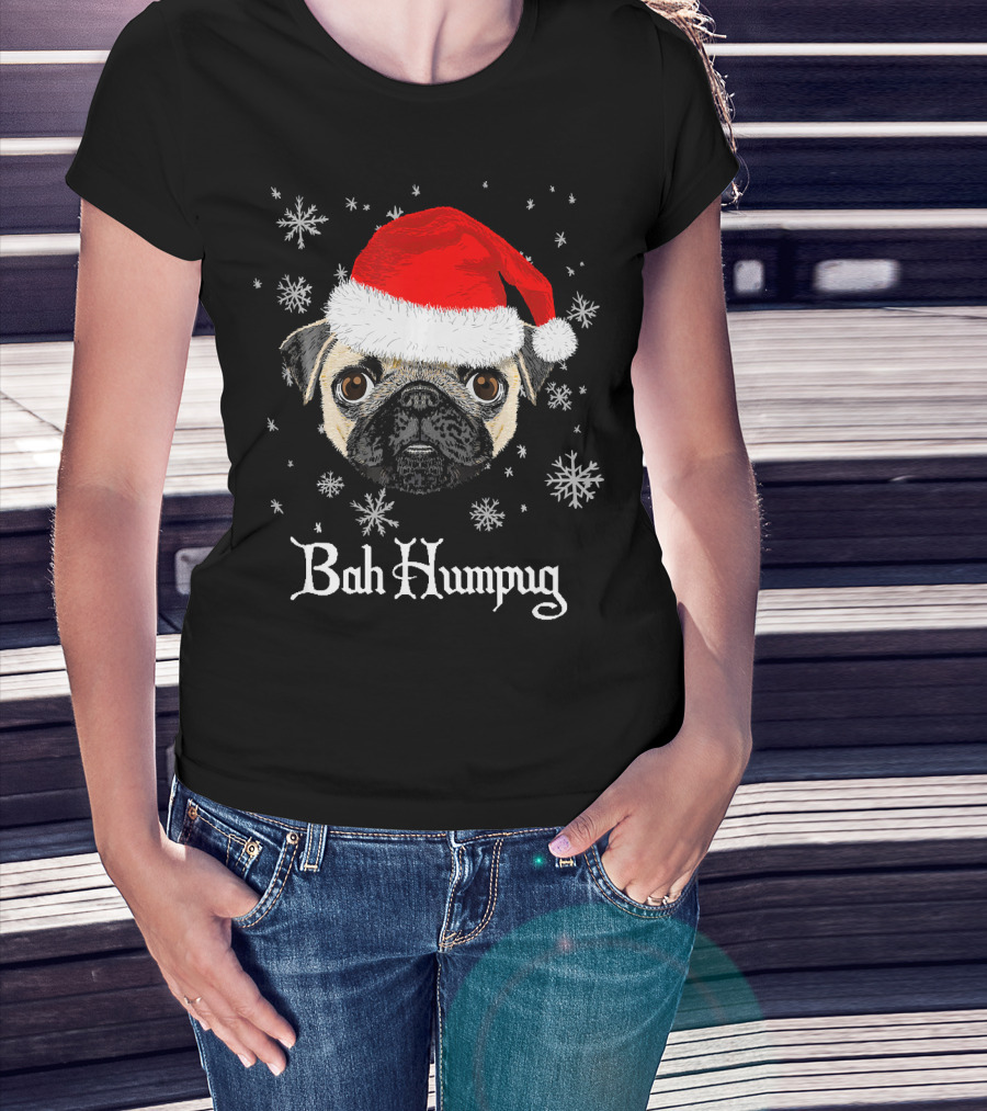 Bah Humpug Funny Christmas Pug Lover Santa Hat Snowflakes T-Shirt