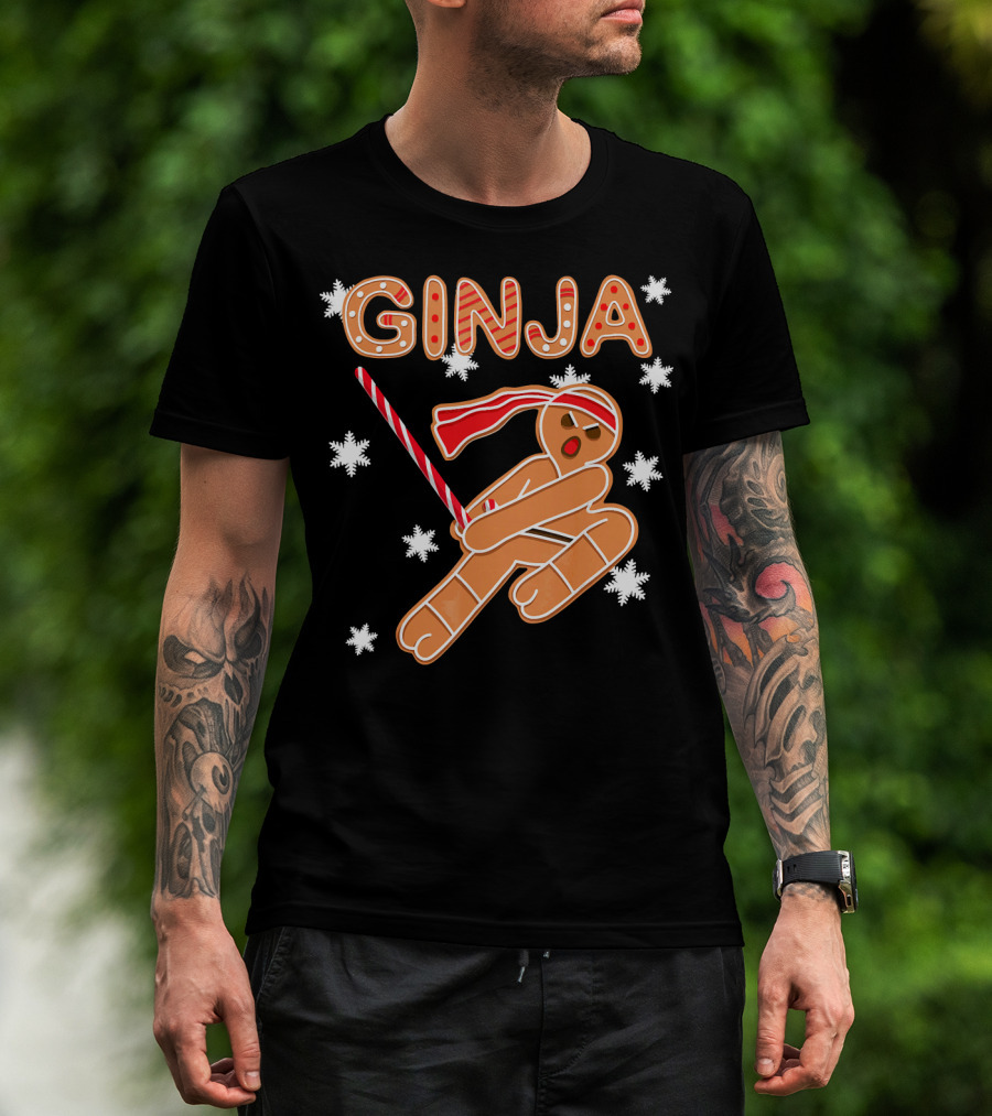 The Gingerbread Ginja Funny Christmas Ninja Candy Cane Snowflakes T-shirt is designed for everyday wear and a consistent fit. Fabric is pre-shrunk ring-spun cotton with durable stitching. See the size chart below for exact measurements.