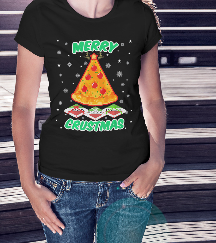 MERRY CRUSTMAS Funny Pizza Christmas Tree With Snowflakes And Pizza Boxes T-Shirt
