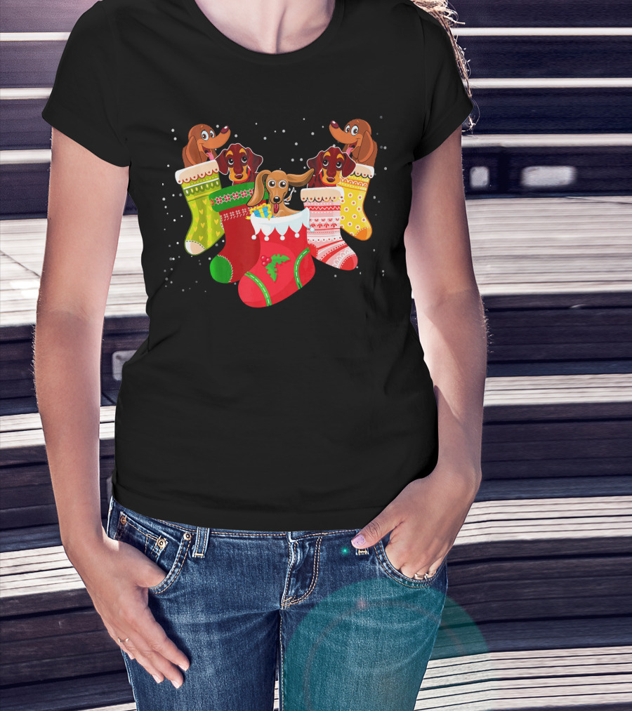 Playful Dachshunds In Colorful Christmas Socks Festive Humor T-Shirt