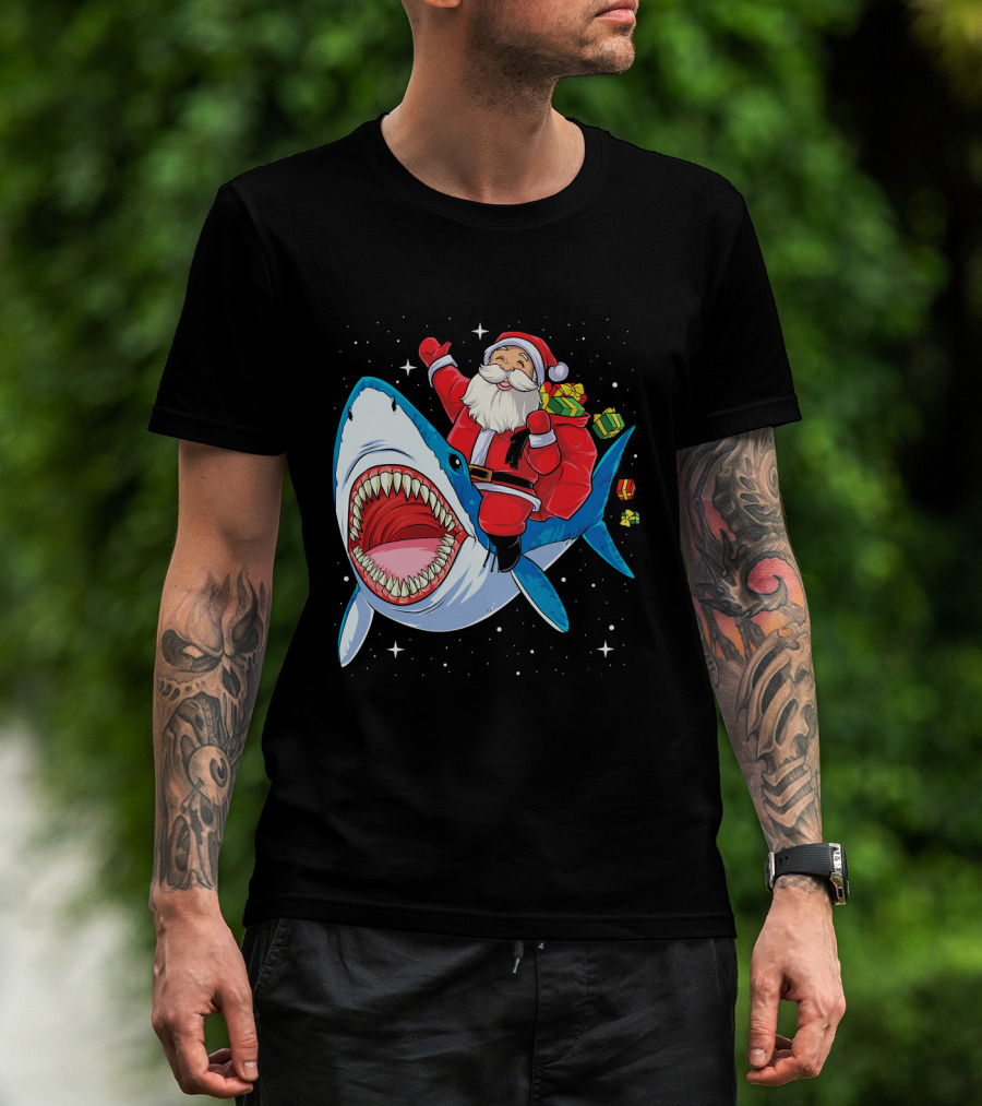 Santa Claus Riding A Shark With Gifts T-Shirt